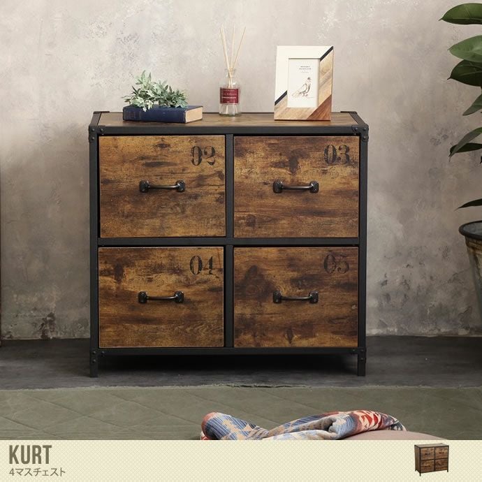 アイアンフレームと、かすれたような数字が描かれた古材風プリント仕上げの本体の組み合わせが、遊び心たっぷりでヴィンテージ感あふれるチェストが登場。フレームのコーナー金具や取っ手など細部にまでこだわったデザインで、ブルックリンスタイルやインダストリアルテイストのインテリアなどと相性バツグン。またデザイン性だけでなく実用性にも優れており、引き出しはスライドレール付きで、片付けや取り出しなどがスムーズです。