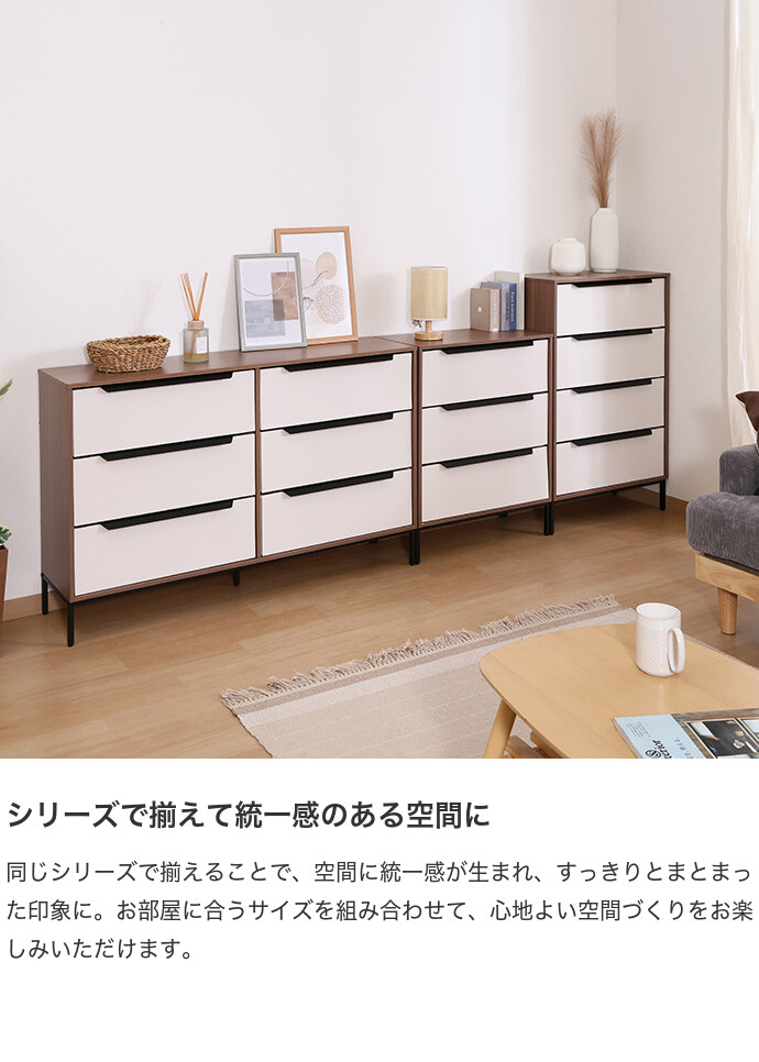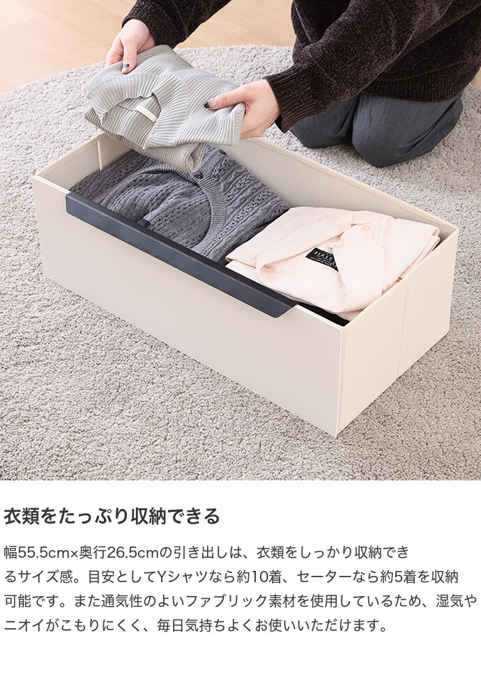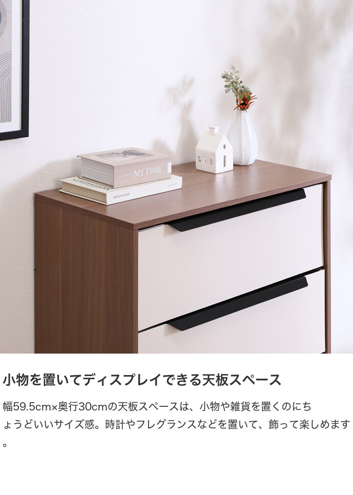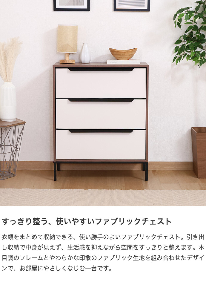 木目調フレームとやわらかなホワイトのファブリックを組み合わせた、ナチュラルな雰囲気のチェスト。明るくやさしい色合いでお部屋に圧迫感を与えにくく、すっきりとした空間づくりに役立ちます。また引き出しは軽量で扱いやすく、衣類をまとめて収納可能。シンプルなデザインで、さまざまなインテリアに取り入れやすい一台です。