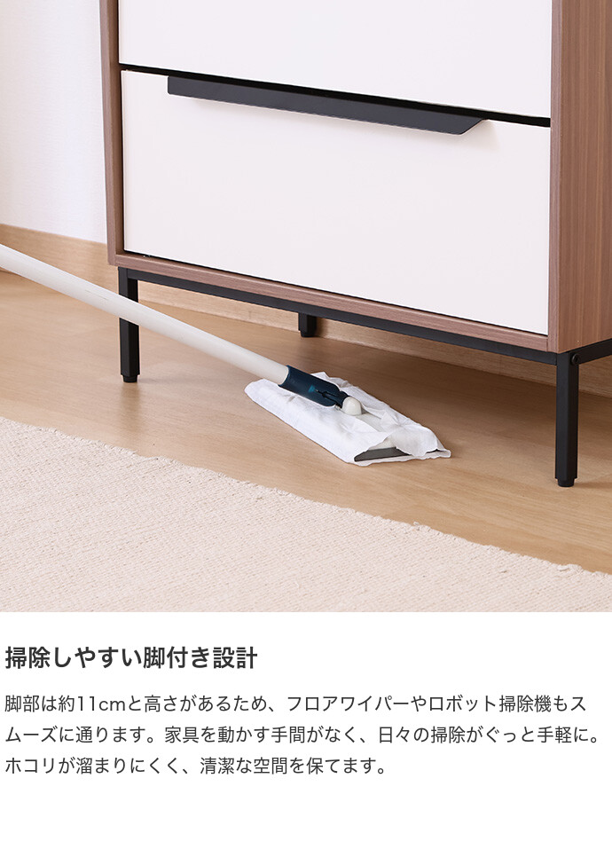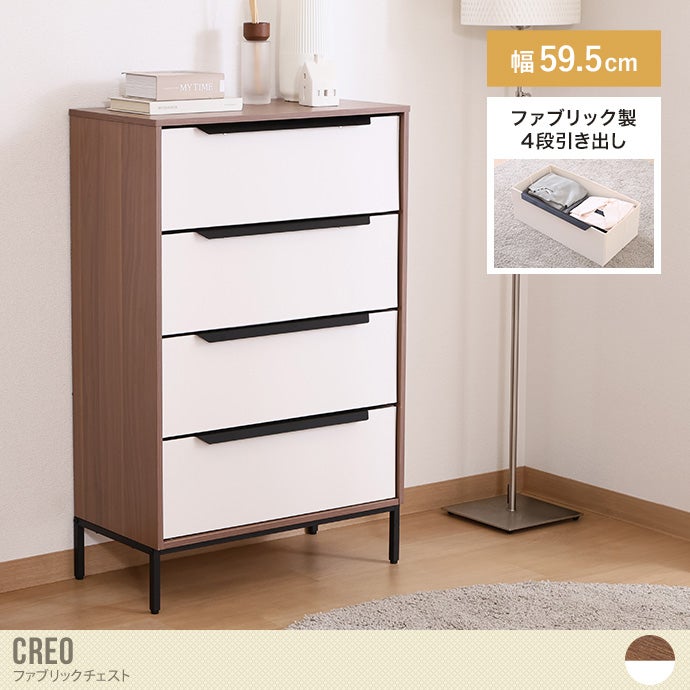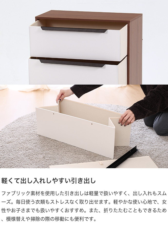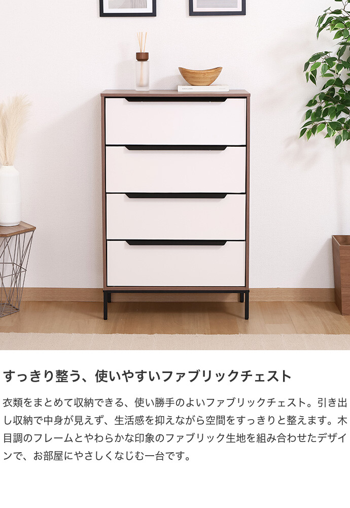 木目調フレームとやわらかなホワイトのファブリックを組み合わせた、ナチュラルな雰囲気のチェスト。明るくやさしい色合いでお部屋に圧迫感を与えにくく、すっきりとした空間づくりに役立ちます。また引き出しは軽量で扱いやすく、衣類をまとめて収納可能。シンプルなデザインで、さまざまなインテリアに取り入れやすい一台です。