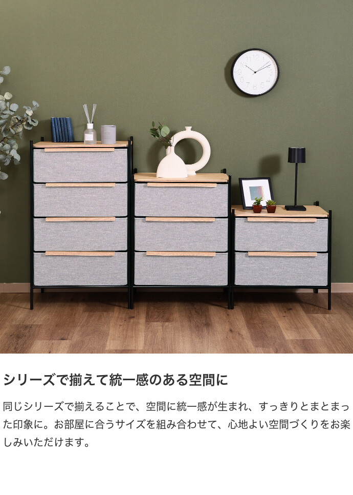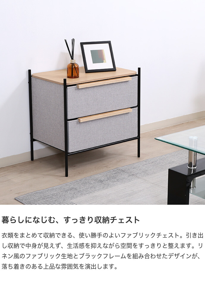 落ち着いたグレーのリネン風ファブリック生地に、ブラックフレームを組み合わせた上品な印象のチェスト。空間を引き締めながらも重くなりすぎず、すっきりとした雰囲気に。また引き出しはファブリック素材を採用しており、軽量かつ通気性が良く、衣類の収納に適しています。生活感を抑えながら、落ち着いた空間作りにぴったりのチェストです。