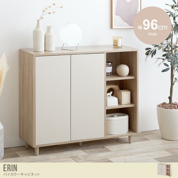 『Erin』シリーズより、美しい木目と清潔感のある白が印象的なバイカラーキャビネットが登場しました。スリムなサイズ感とフラットな扉はお部屋に圧迫感を与えずすっきり置けるので、ワンルームなどの限られたスペースにも最適。省スペースを上手く利用して配置していただけます。また、しっかり収納できる大容量収納となっており、扉収納は隠す収納として、オープンスペースは魅せる収納として使い分けながらお使いいただけます。