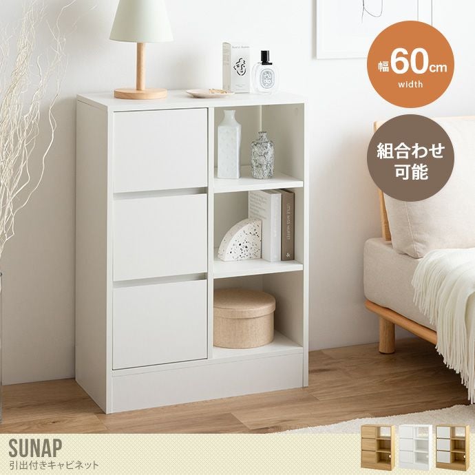 収納物に合わせて、隠す収納と見せる収納ができる『Sunap』シリーズの引出付きキャビネット。シンプルでノイズレスなデザインは様々な空間と相性抜群です。また、スリム設計にしつつ引出、オープンと2タイプの収納を備え付けているので、たっぷり収納していただけます。さらに収納力をUPさせたい方には、シリーズ商品を組合せてのご使用もおすすめです。