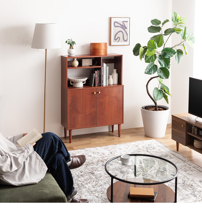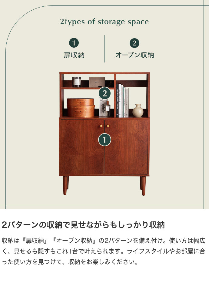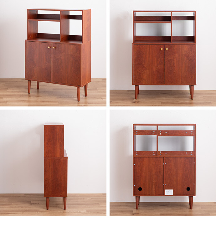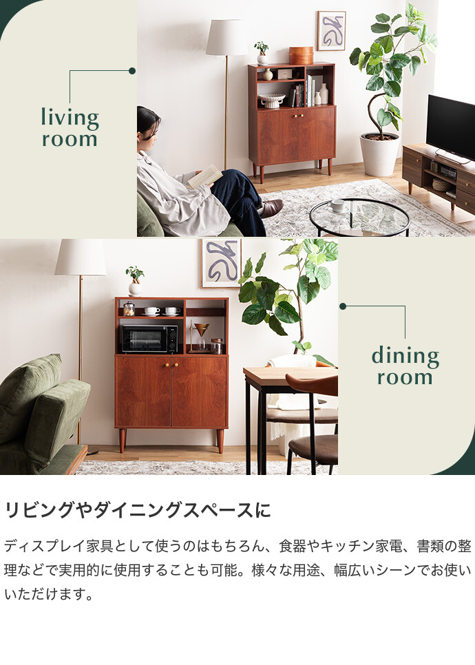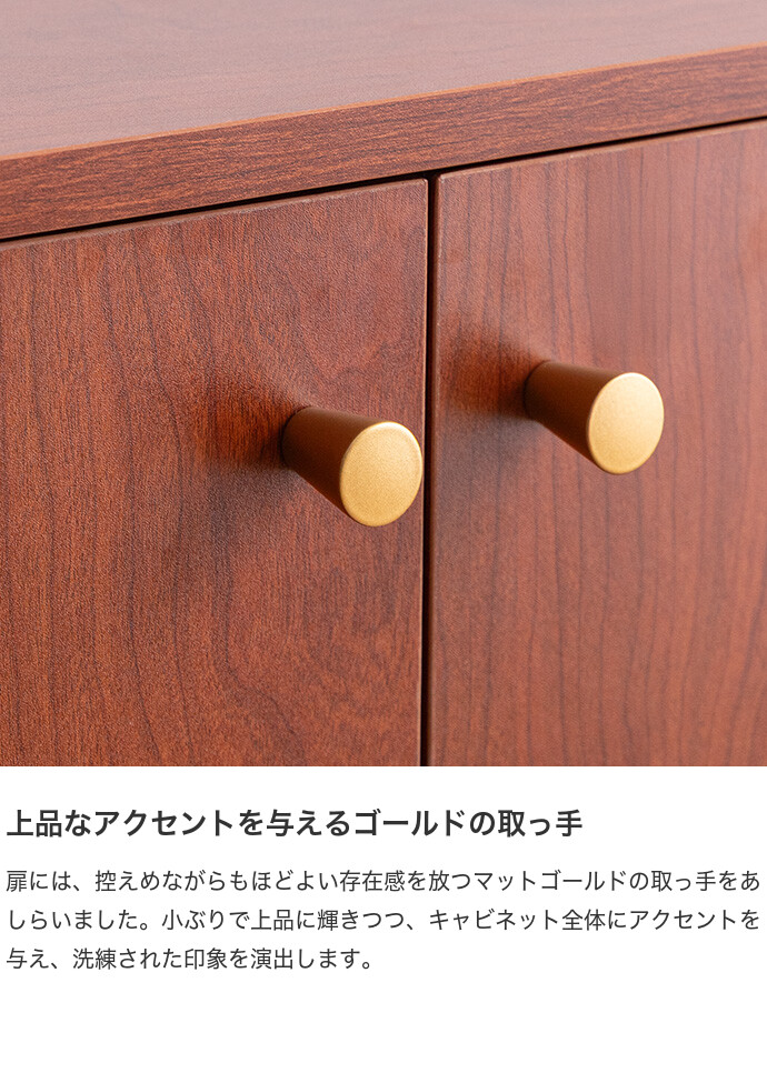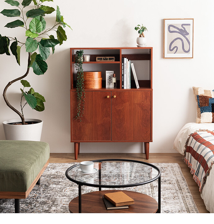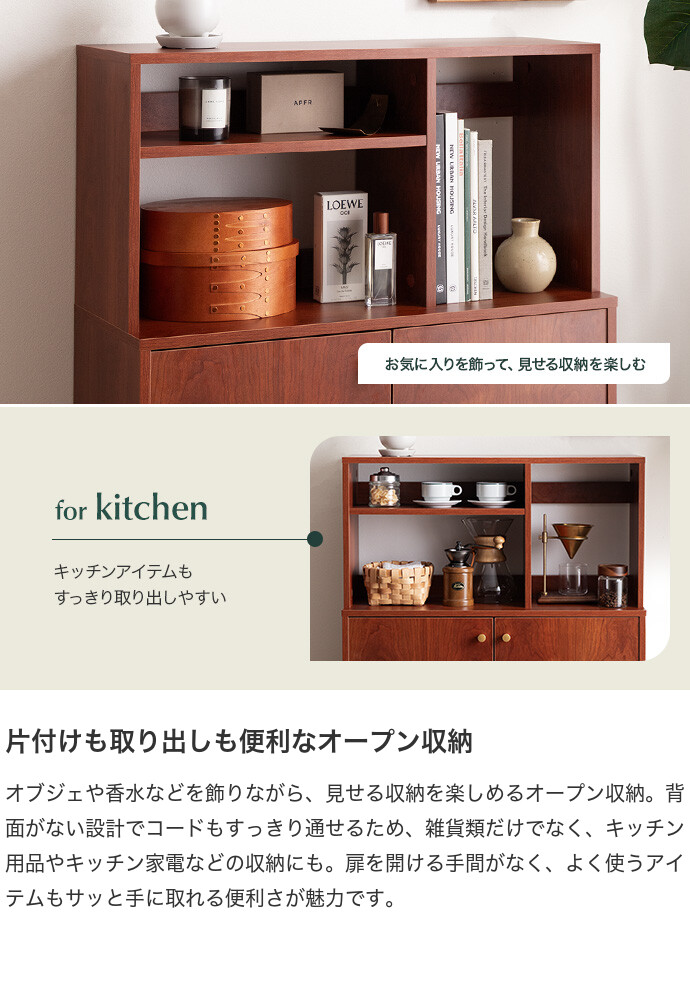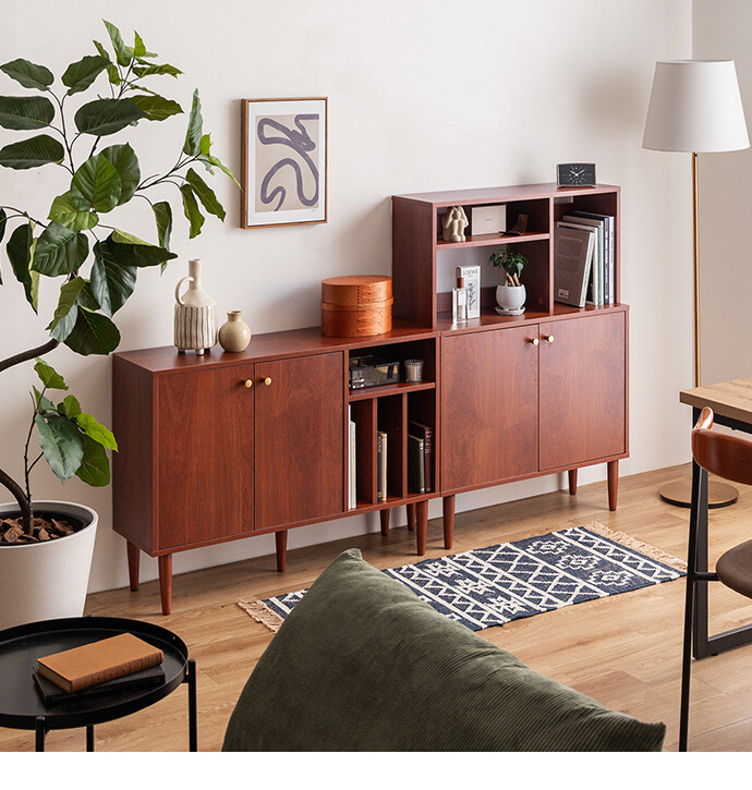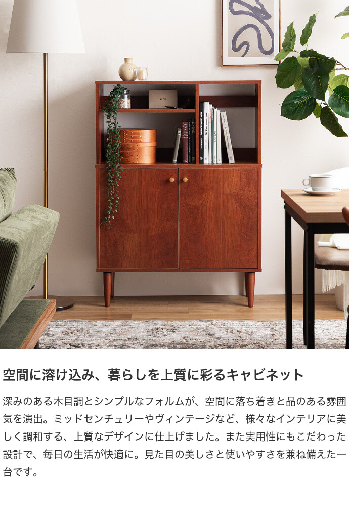 空間に溶け込み、暮らしを上質に彩る本棚付きキャビネット。ヴィンテージ家具のような経年劣化した、深みある表情の木目調とシンプルなフォルムが、空間に落ち着きと品のある雰囲気を演出。ミッドセンチュリーやヴィンテージなど、様々なインテリアに美しく調和する、上質なデザインに仕上げました。また実用性にもこだわった設計で、毎日の生活が快適に。見た目の美しさと使いやすさを兼ね備えた一台です。