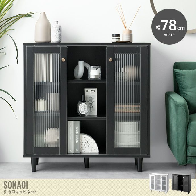 コンパクトながら機能性と美しさを兼ね備えた『Sonagi(ソナギ)』引き戸キャビネット。扉は引き戸式のため、スライドすることで見せると隠すが使い分けられます。扉のモールガラスが収納物を程よく隠すため、生活感を抑えて軽やかな空間を演出。モノトーンの本体とゴールドの取っ手が上品で、置くだけで海外インテリアのような上質な空間を実現します。