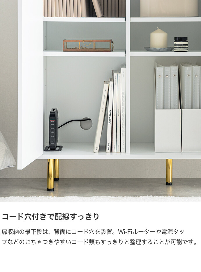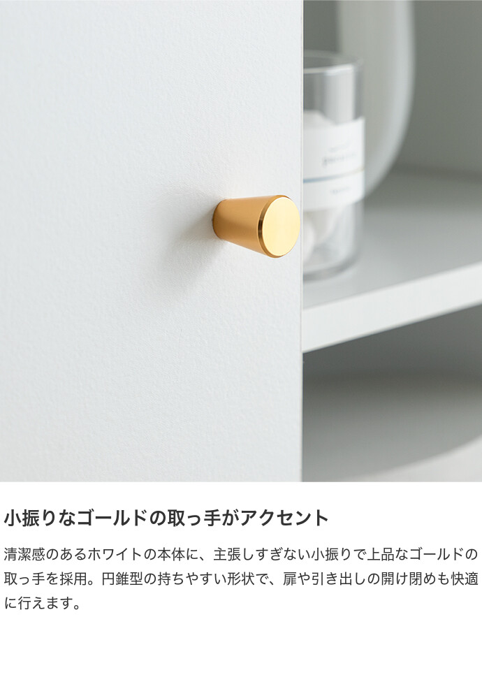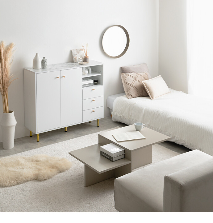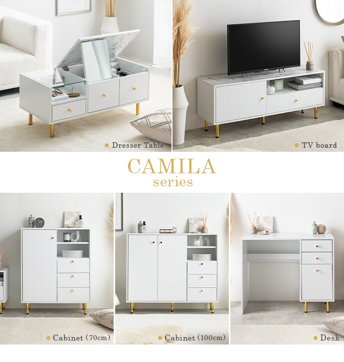 天板の大理石柄とゴールドのあしらいが特徴の『Camila(カミラ)』シリーズのキャビネット。大人かわいいデザインの本体とスタイリッシュなゴールド脚付きで、置くだけでお部屋の雰囲気を高めてくれます。3つの収納スペースと背面のケーブル穴で、ごちゃつきがちな雑貨や雑誌、LANケーブル類などもスマートに整理でき、生活感がなく美しい空間を実現可能です。また奥行は約34.4cmとスリム設計のため、一人暮らしやワンルームなど限られたスペースにもすっきり置いていただけます。