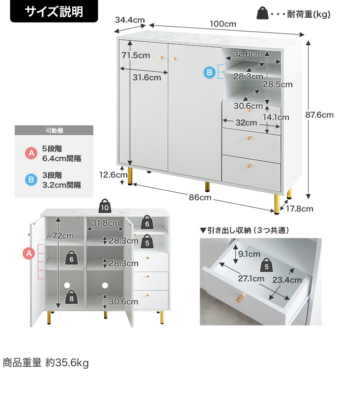 【耐荷重】天板:約10kg、可動棚:(各)約6kg、オープン収納底板:約5kg、扉収納底板:約8kg、引き出し底板:(各)約5kg