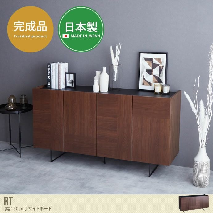 モダンで高級感のある木目が特徴のRTシリーズ。前板にはブラウンの濃淡が美しいウォルナットの突板を使用しています。木のぬくもりがお部屋に安らぎと癒しの空間を与えてくれます。また、ブラックのスチール脚がモダンさをプラス。おしゃれに、そして高級感あふれるお部屋にしたい方にぴったりです。さらに、幅、奥行共にしっかりあるので収納力も抜群。隠す収納+可動棚でしっかり収納し、お部屋をすっきり見せることができます。