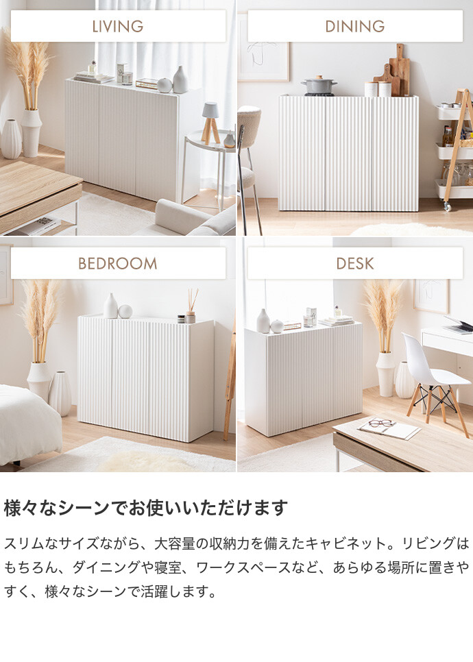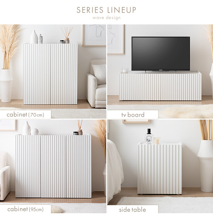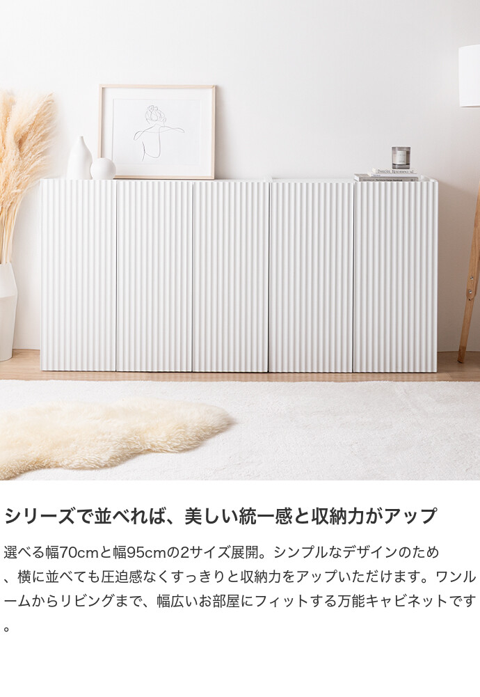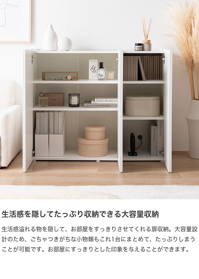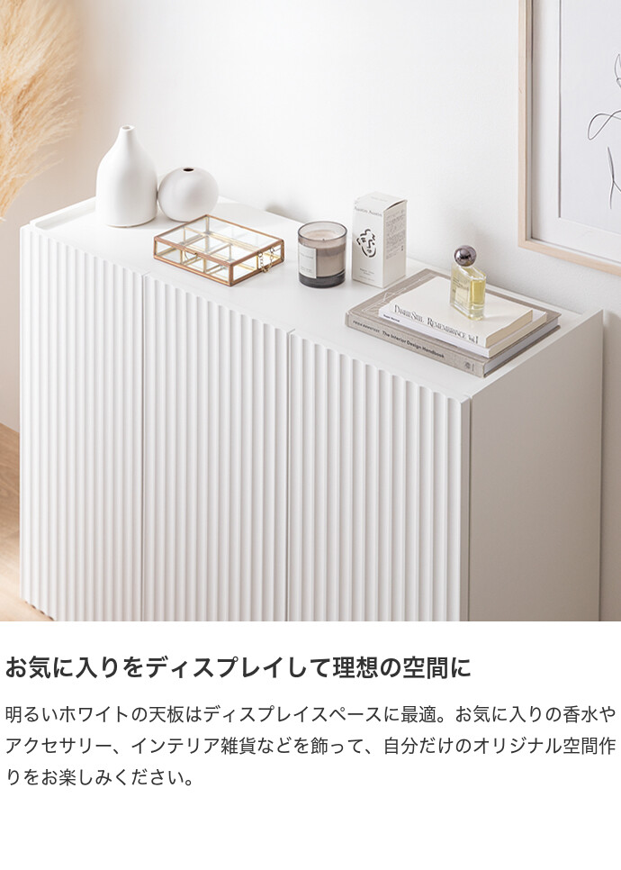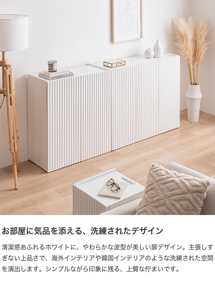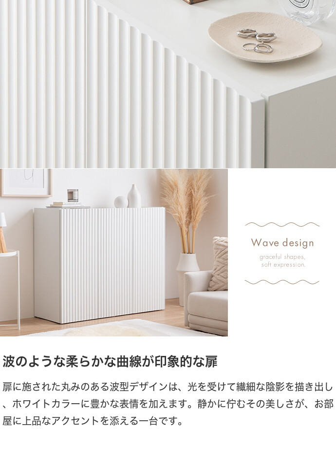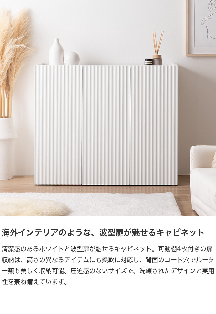 清潔感のあるホワイトと波型扉が魅せるキャビネット。お部屋に気品を添える美しいデザインは、主張しすぎない上品さで、海外インテリアや韓国インテリアのような洗練された空間を演出します。可動棚4枚付きの扉収納は、高さの異なるアイテムにも柔軟に対応し、背面のコード穴でルーター類も美しく収納可能。圧迫感のないサイズで、洗練されたデザインと実用性を兼ね備えています。