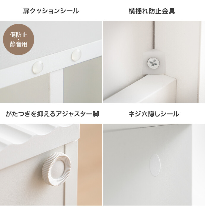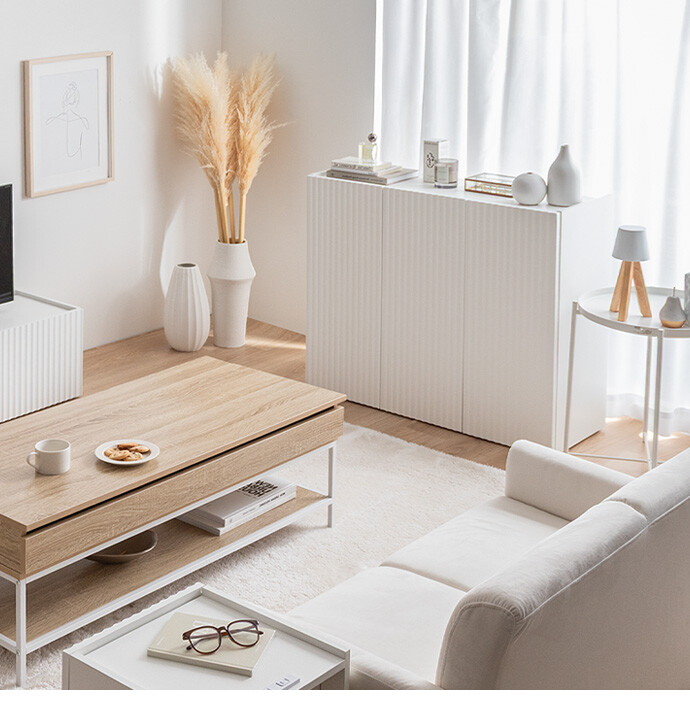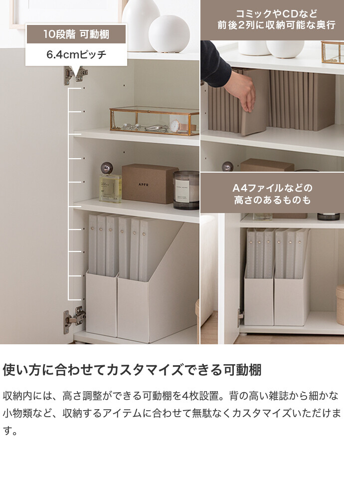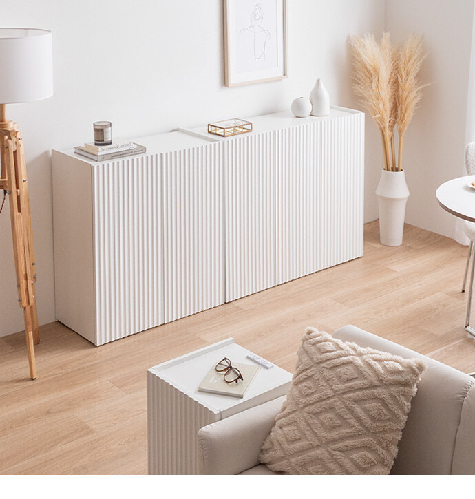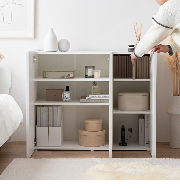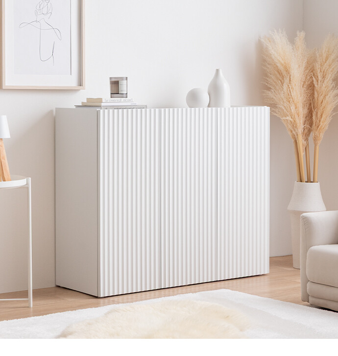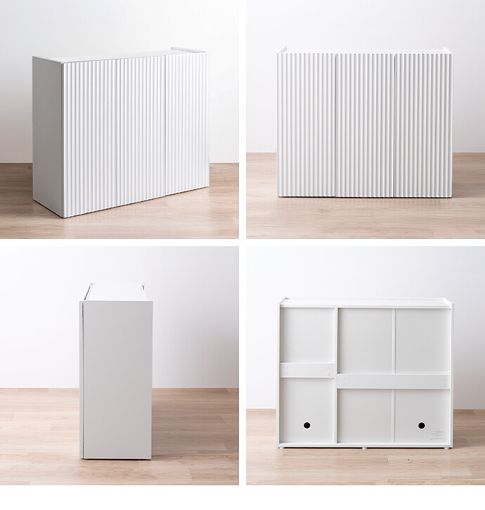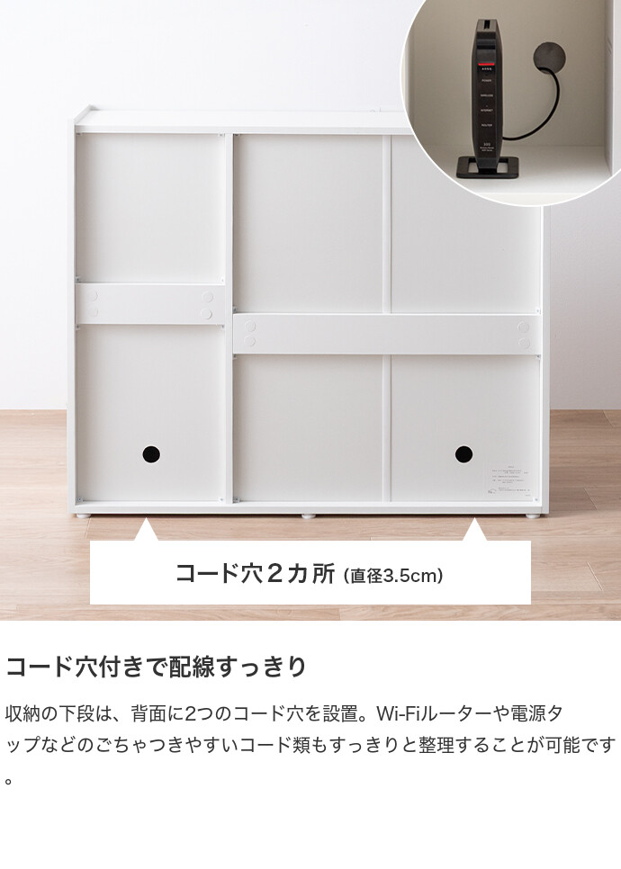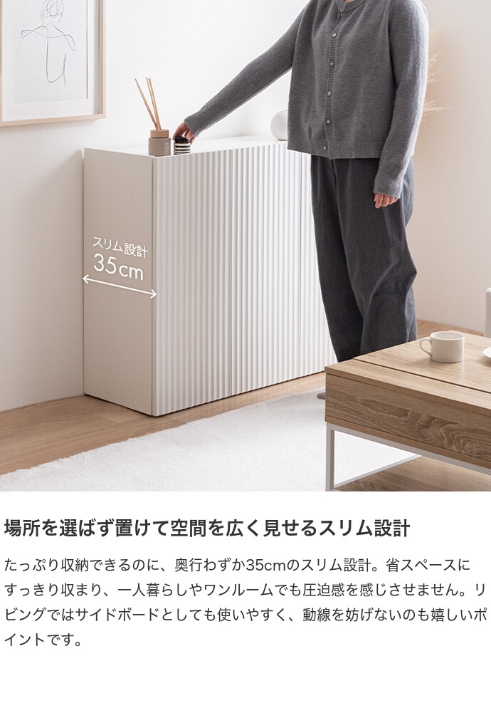 清潔感のあるホワイトと波型扉が魅せるキャビネット。お部屋に気品を添える美しいデザインは、主張しすぎない上品さで、海外インテリアや韓国インテリアのような洗練された空間を演出します。可動棚4枚付きの扉収納は、高さの異なるアイテムにも柔軟に対応し、背面のコード穴でルーター類も美しく収納可能。圧迫感のないサイズで、洗練されたデザインと実用性を兼ね備えています。
