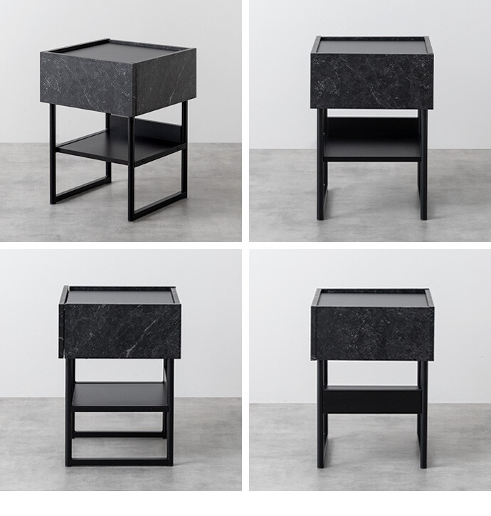 大人モダンな雰囲気が特徴のサイドテーブル。直線的でシンプルな見た目ながら、引き出しとオープン棚付きでデザイン性だけでなく機能面にもこだわりました。背面も美しい仕上がりになっているため、お部屋のお好きな位置に設置可能です。ソファ横で飲み物やスマホなどを置いたり、ベッド横で時計や眼鏡を置く宮棚の代わりにしたり、様々なシーンでご活用いただけます。