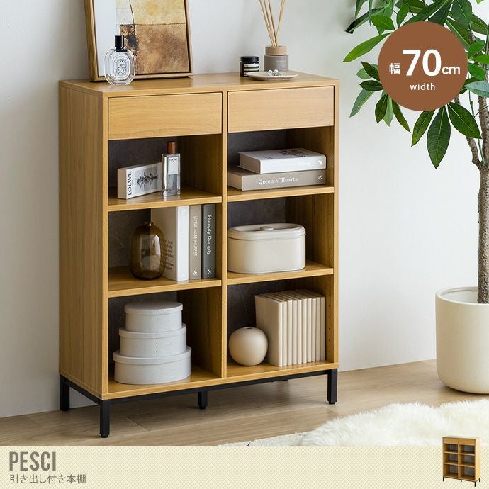 ヴィンテージ感のある木目調とストーン調の組み合わせが、お部屋をおしゃれに演出する『Pesci(ペッシ)』シリーズの引出し付き本棚。19段階で動く4つの可動棚はお好みの高さに調節ができ、スペースの無駄なく収納することができます。また、コンパクトで置きやすいサイズ設計なので、一人暮らしやワンルームにお住まいの方にもピッタリです。