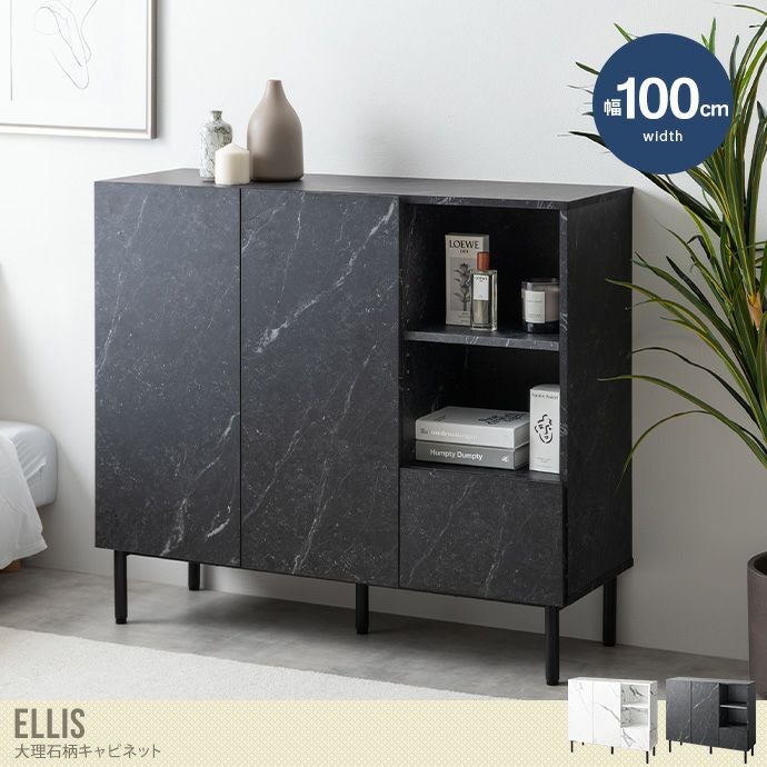 【送料無料】Ellis エリス 幅100 キャビネット サイドボード チェスト ラック 大理石柄 ストーン 収納 本棚 スリム 扉付き 引き出し 可動棚 コード穴 配線 ディスプレイ リビング 高級感 ルーター A4 脚付き 一人暮らし マーブルホワイト