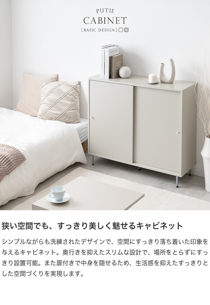 【送料無料】Putie プティ 幅90 キャビネット 棚 チェスト サイドキャビネット 扉収納 サイドボード 収納 本棚 おしゃれ おすすめ 安い スリム コンパクト 白 小さめ 小さい 引き戸 可動棚 大容量 かわいい ワンルーム 一人暮らし ホワイト