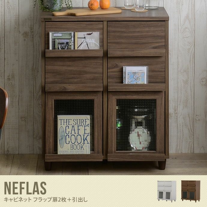 雑然となりがちなCD、DVD、本などが1台にすっきりと収納できるディスプレイ家具『NEFLAS(ネフラス)』キャビネット(フラップ扉2枚+引出し)。 開閉が自由なフラップ扉は、普段は開けたまま使い、隠したいときには扉を引き出せば隠せます。クロスガラスでモザイクをかけたように中身がみえるのも特徴。ブラウンとホワイトの2色展開です。