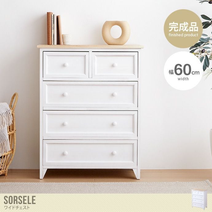 アンティーク塗装が施され、天然の木目の風合いを感じさせるコンパクトサイズの『Sorsele』幅60cmワイドチェスト。大小5杯の引き出しは季節やアイテムごとに衣類などの仕分けをするのに便利です。また、コンパクト設計なので幅を取らず、一人暮らしやワンルームにもおすすめです。