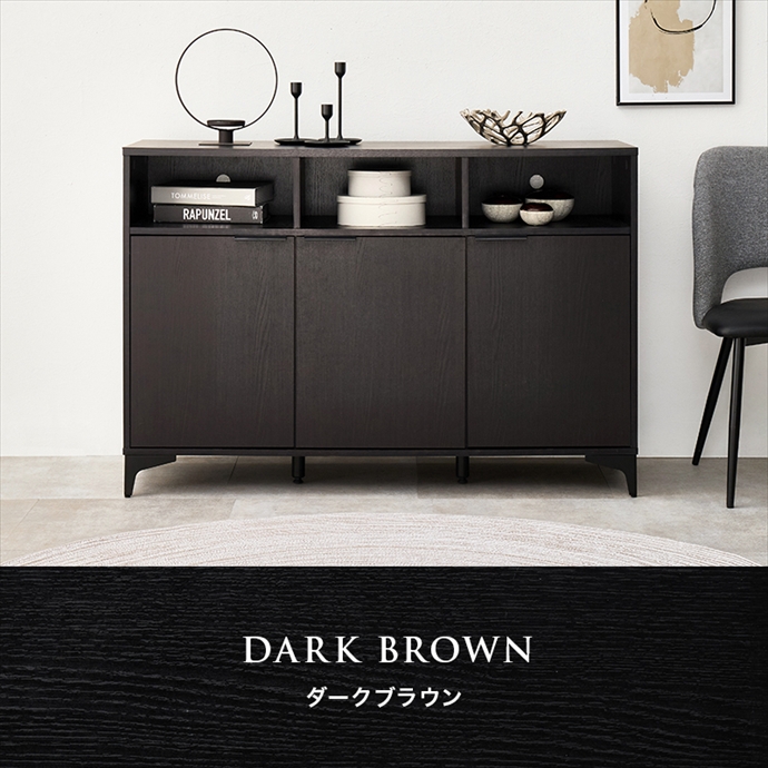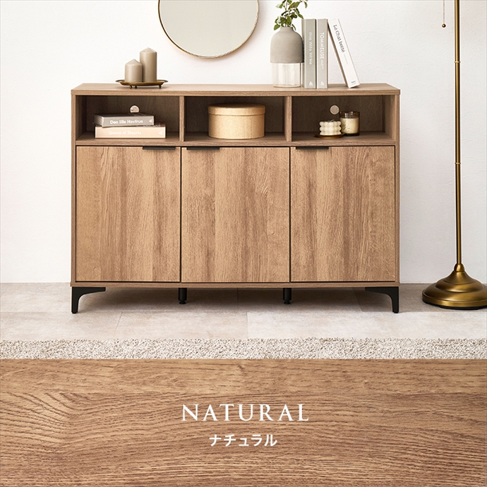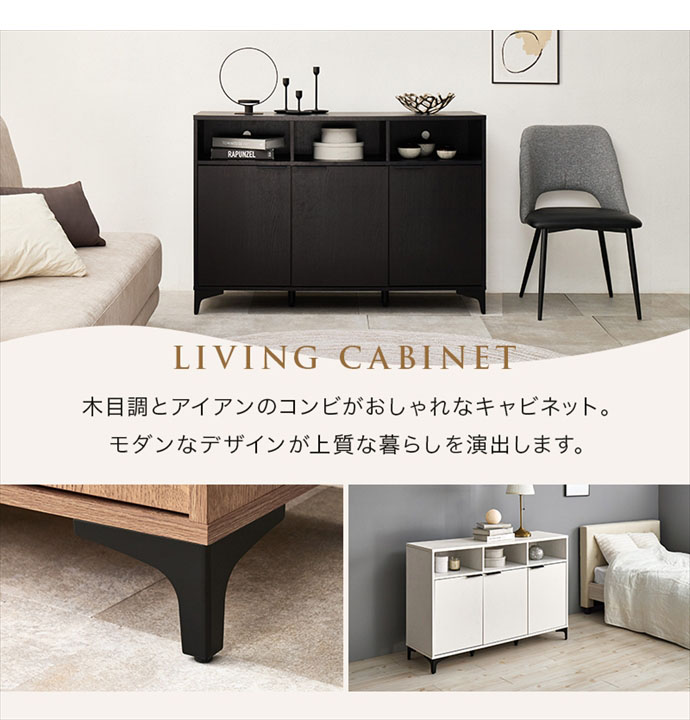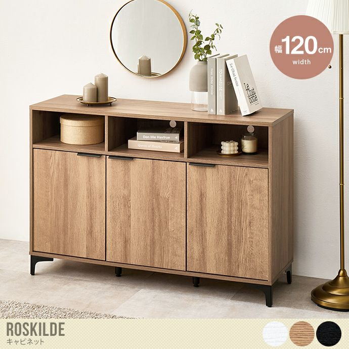 木目調の本体とシャープなアイアン脚を組み合わせた『Roskilde(ロスキレ)』キャビネット。木目の温かみとアイアンのシャープさが空間を程よく引き締め、洗練された空間を演出します。さらに2種類の収納スペースを備えており、扉収納にはごちゃつきがちな日用品や小物をまとめてスッキリ収納。コード穴付きのオープン収納には、ライトやお気に入りの雑貨類を飾ってディスプレイとしてもお楽しみいただけます。