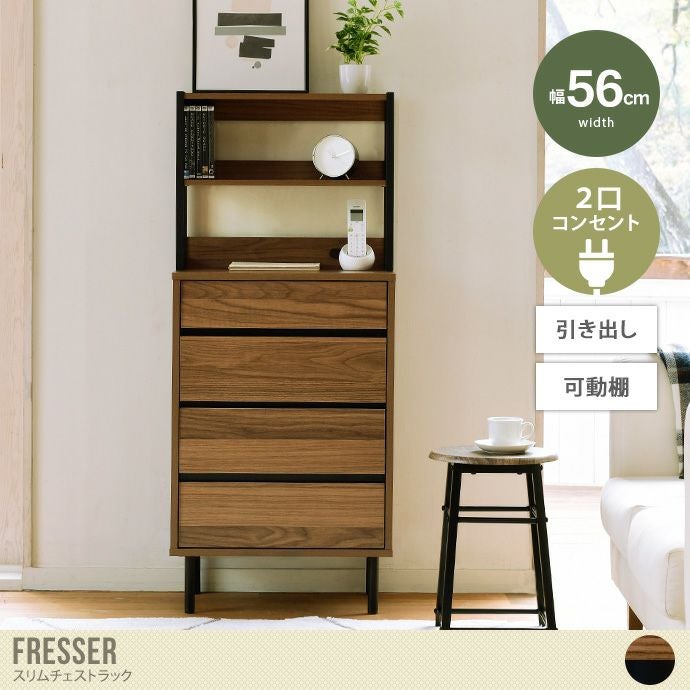 他の画像を見る 【送料無料】幅56 収納 チェスト 整理タンス キャビネット 洋服 衣類 ラック サイドボード リビング スリム 薄型 大容量 脚付き 4段 木製 アジャスター付き 引き出し 間仕切り 飾り棚 2口コンセント 薄い 可動棚 高さ調節 ディスプレイ ブラウン/ブラック 販売価格 ¥ 25,460 税込 送料込 カートに入れる お気に入りに登録する