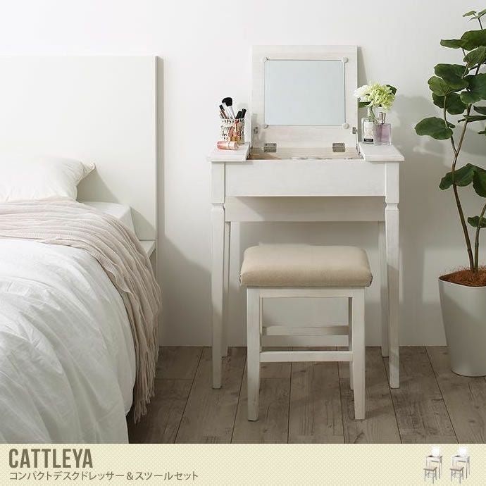 ついお友達に自慢したくなる素敵なドレッサー♪cattleya(カトレア)、コンパクトサイズのデスクドレッサーとスツールがセットになっています。ポイントは収納スぺース!メイク道具もスキンケア品もまとめてしまえるので整理整頓にとっても便利♪サッと手に取れる利便性が嬉しいですね~ミラーは顔全体が写る大きさなので毎日のメイクもうまくできそうです。開閉式で使わない時は扉を閉めるとデスクに早変わり!スツールは座り心地が良く、愛らしくてキュートです。この機会にぜひ!!