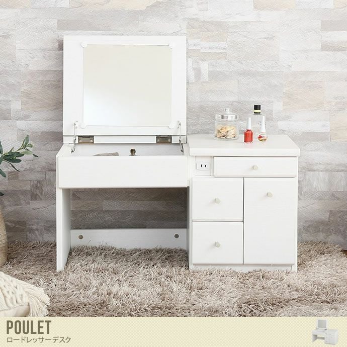こだわりが詰まった『Poulet』ロードレッサーデスクの登場です。ナチュラルから人気の北欧テイストのインテリアと相性抜群! コンパクト設計だから、お部屋が狭いワンルームの方におすすめですよ。天板を閉じれば、ローデスクとしても活躍するので、このドレッサー1台で2役こなしますよ。複数の引き出し収納がありますので、メイク用品を分けて収納いただけます◎ 1口コンセントも付いていますので、そのままお出かけ前のヘアセットもできます。嬉しい機能がたくさん付いたおすすめのドレッサーです。
