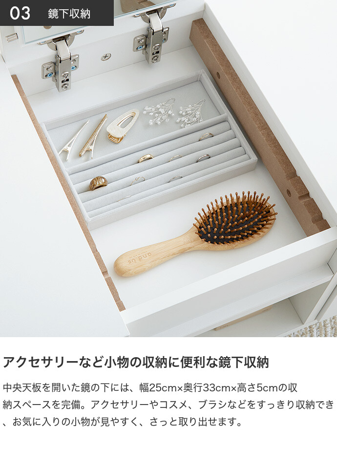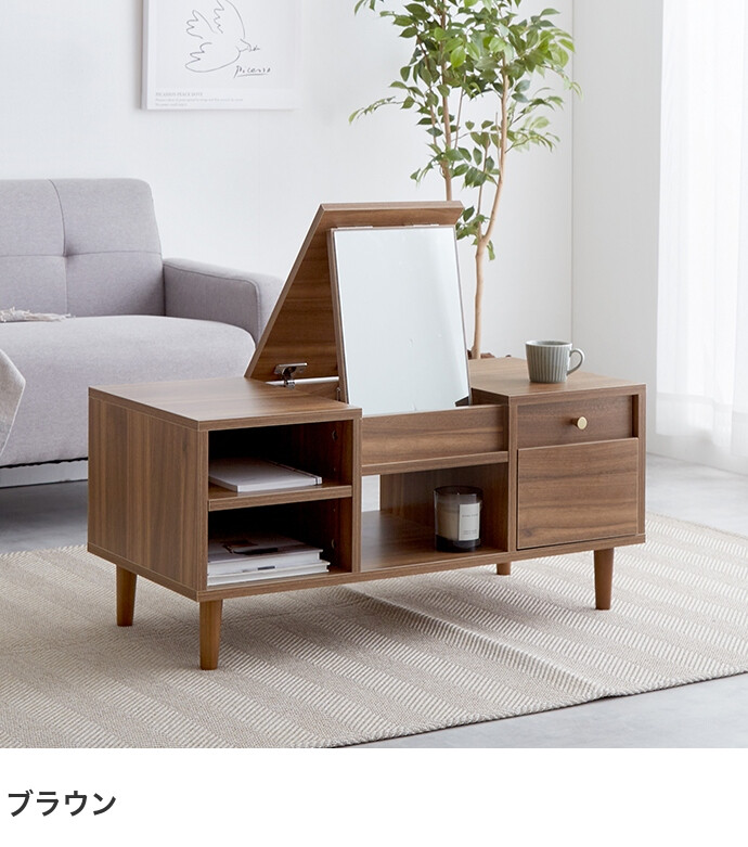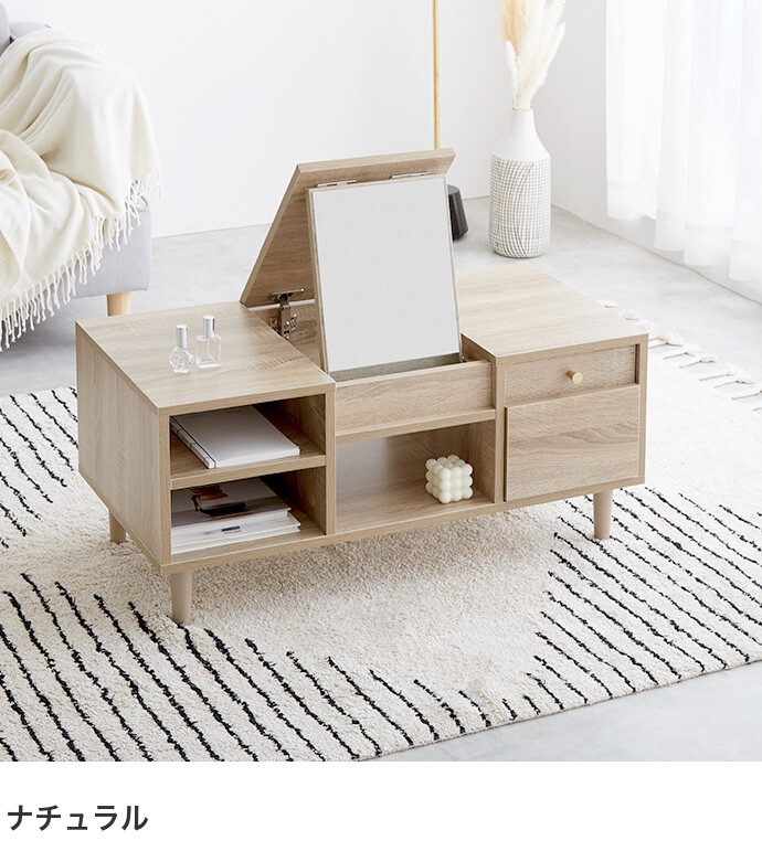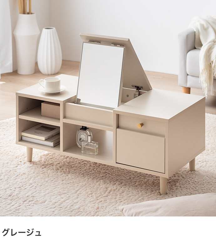 スペースに余裕がない方に嬉しい、1台で2役を担う『Charme(シャルム)』ドレッサーテーブル。食事やティータイム、作業や仕事のためのセンターテーブル。お風呂上りのスキンケアや朝の身支度のためのドレッサー。どちらもを置くスペースが無いワンルーム女子に嬉しい1台2役のドレッサーテーブルです。大きめの鏡は全体を確認できるので、バランスをとりながらメイクやヘアセットをしていただけます。また、鏡は3段階で調整していただけるので、ベストな角度と距離感でご利用いただけます。