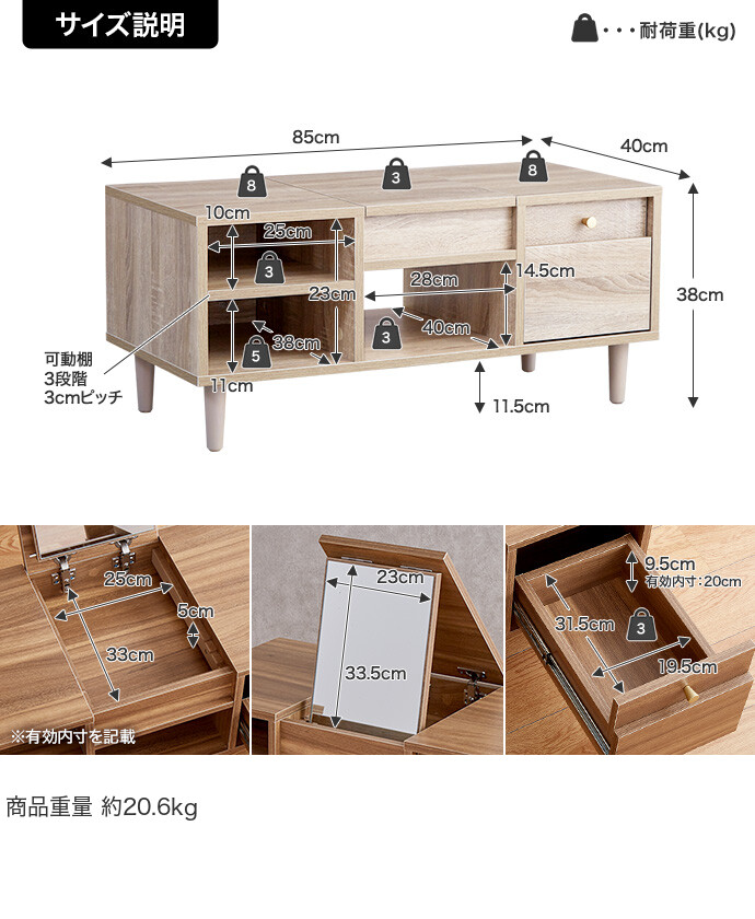 【耐荷重】天板:約8kg、棚板:約3kg、底板:約5kg、引出:約3kg