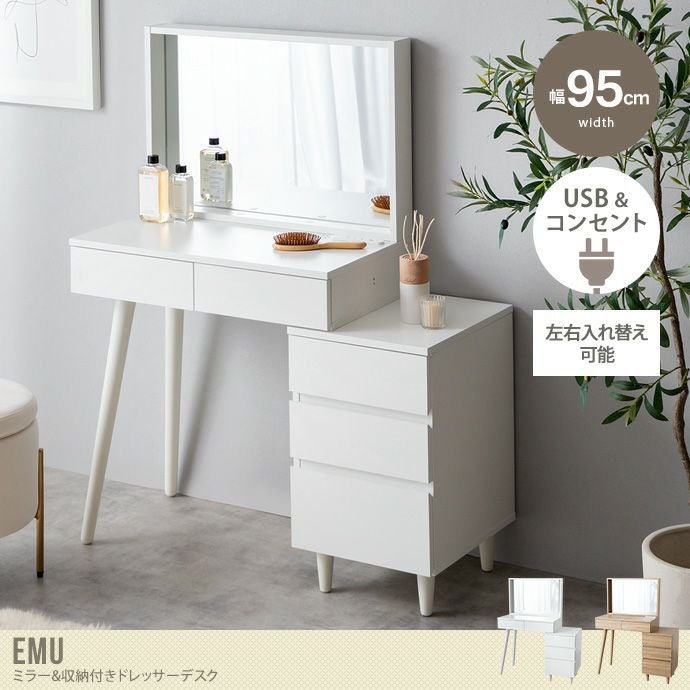 【送料無料】Emu エミュ 幅95 ドレッサー チェスト付き 鏡台 デスク テーブル 化粧台 おしゃれ おすすめ 安い コンパクト 大容量 収納 鏡 ミラー コンセント USBポート 小さい 引き出し 一面鏡 木目調 一人暮らし ワンルーム リビング 寝室 ホワイト