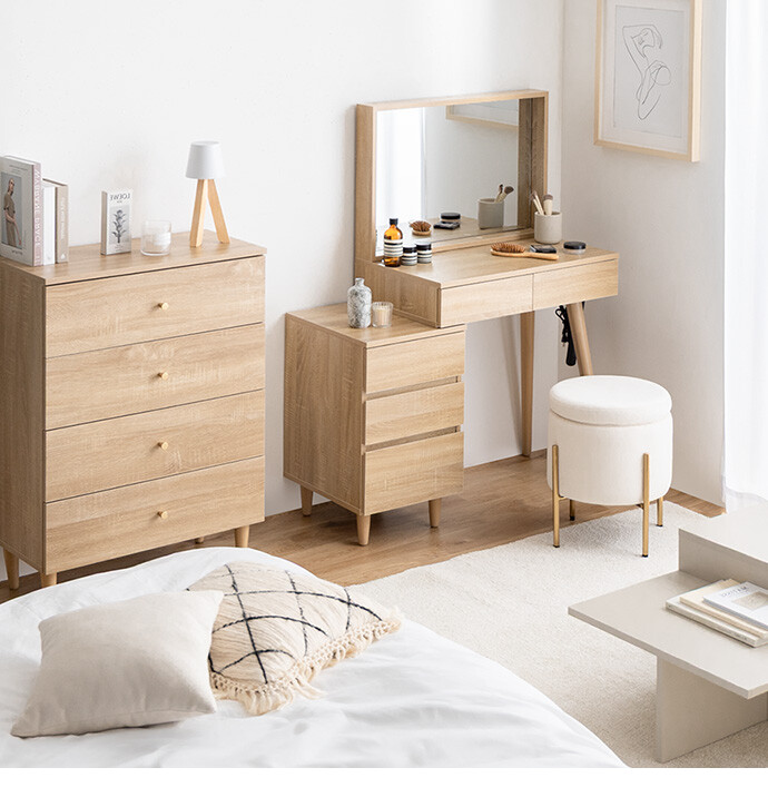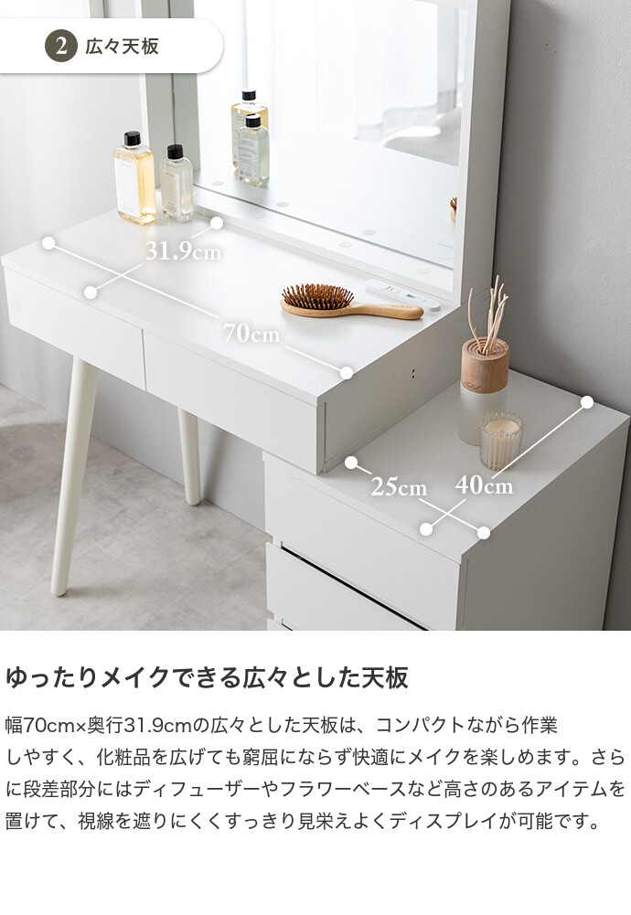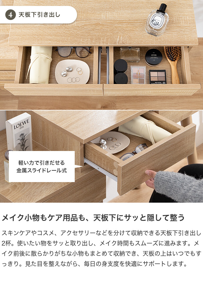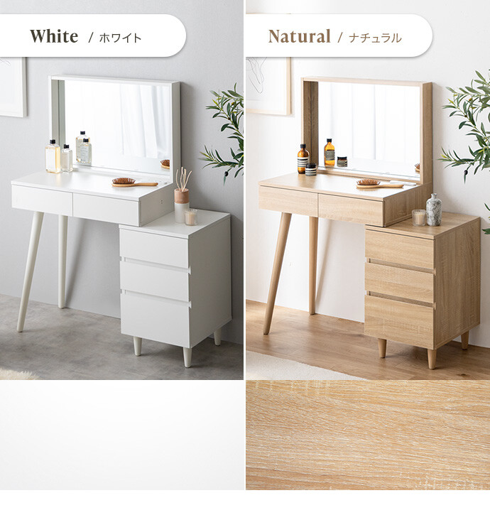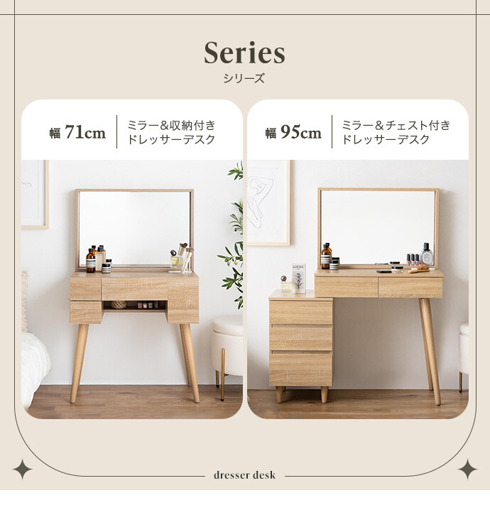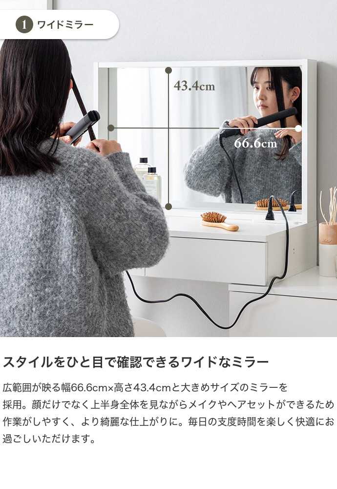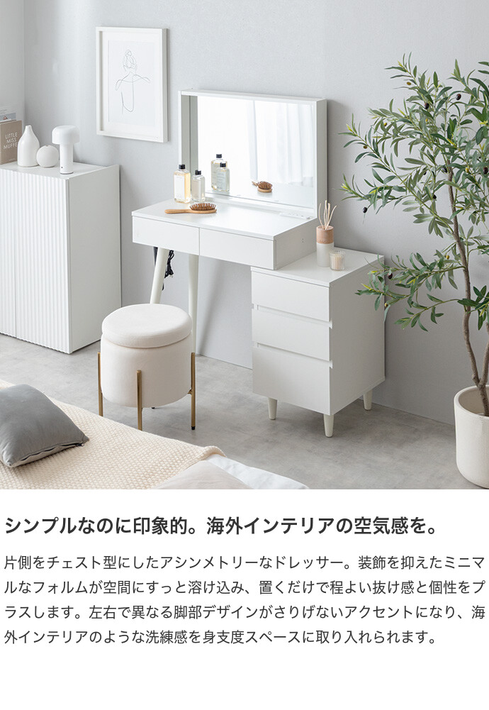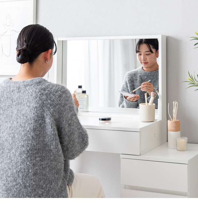 海外インテリアのような洗練されたドレッサー空間を、あなたのおうちに。置くだけでお部屋が上質な空間に変わるドレッサーシリーズ。大きなミラーと大容量収納に、便利なコンセント付きで使い勝手も抜群。お気に入りのインテリアに囲まれて楽しむメイク時間が、心を豊かにしてくれます。