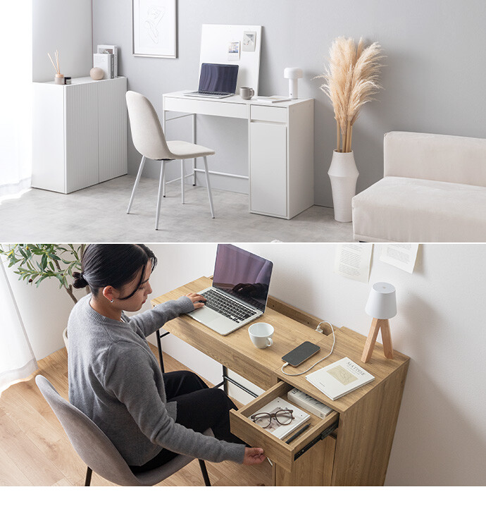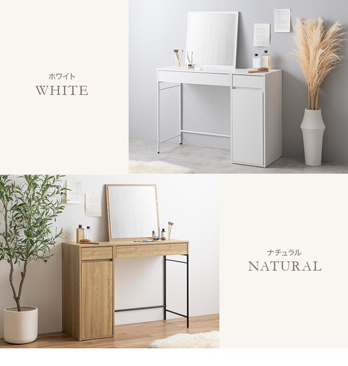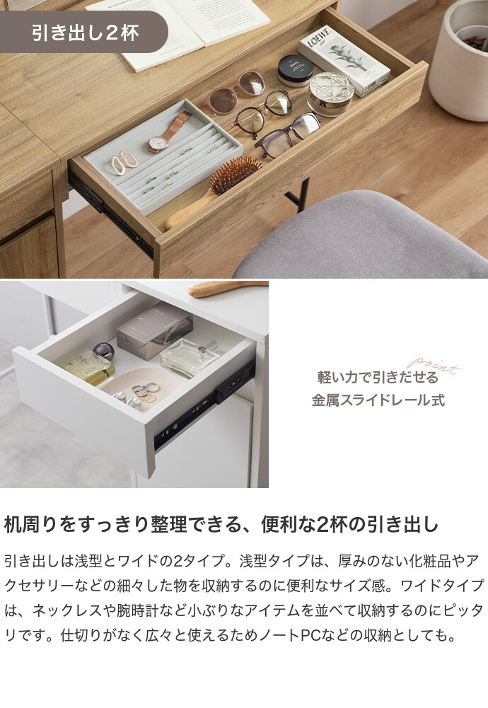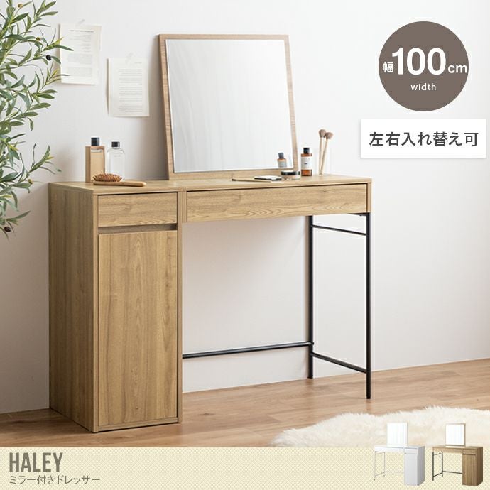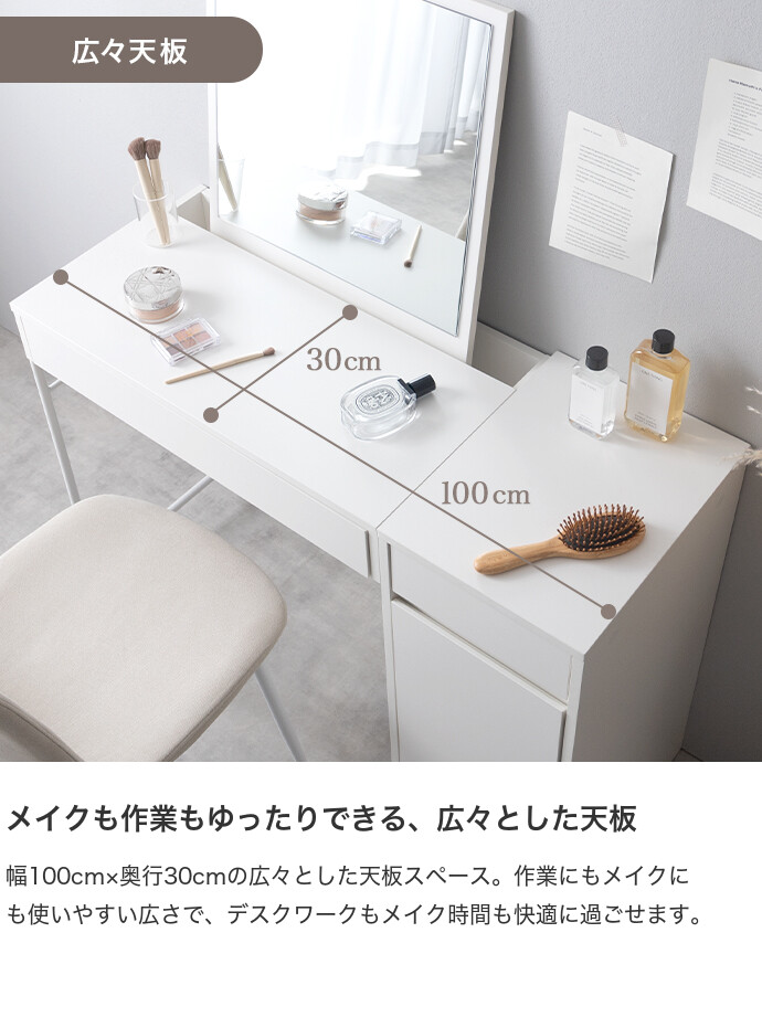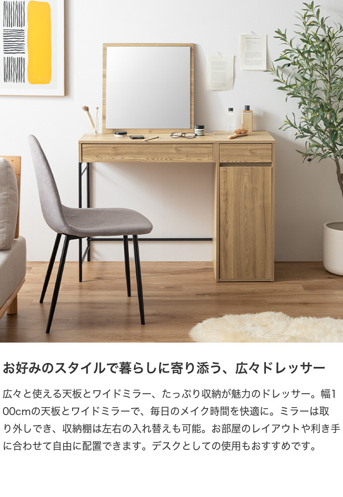 広々と使える天板とワイドミラー、たっぷり収納が魅力のドレッサー。幅100cmの天板とワイドミラーで、毎日のメイク時間を快適に。ミラーは取り外しでき、収納棚は組み立て時に左右の入れ替えも可能。お部屋のレイアウトや利き手に合わせて自由に配置できます。また、ミラー立てかけ利用時にはミラーを裏向けることでデスクとしてお使いいただくことも。