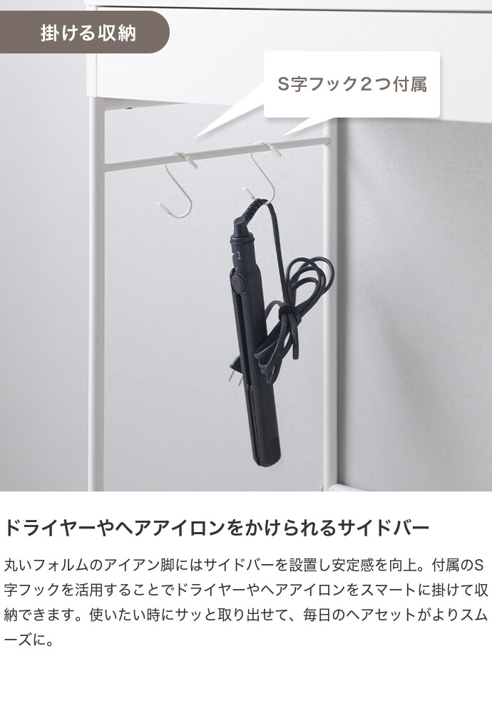 【耐荷重】天板:約40kg、引き出し:(各)約5kg、可動棚:約10kg、扉収納底板:約15kg、サイドバー:約0.5kg、ミラー置き場:約5kg