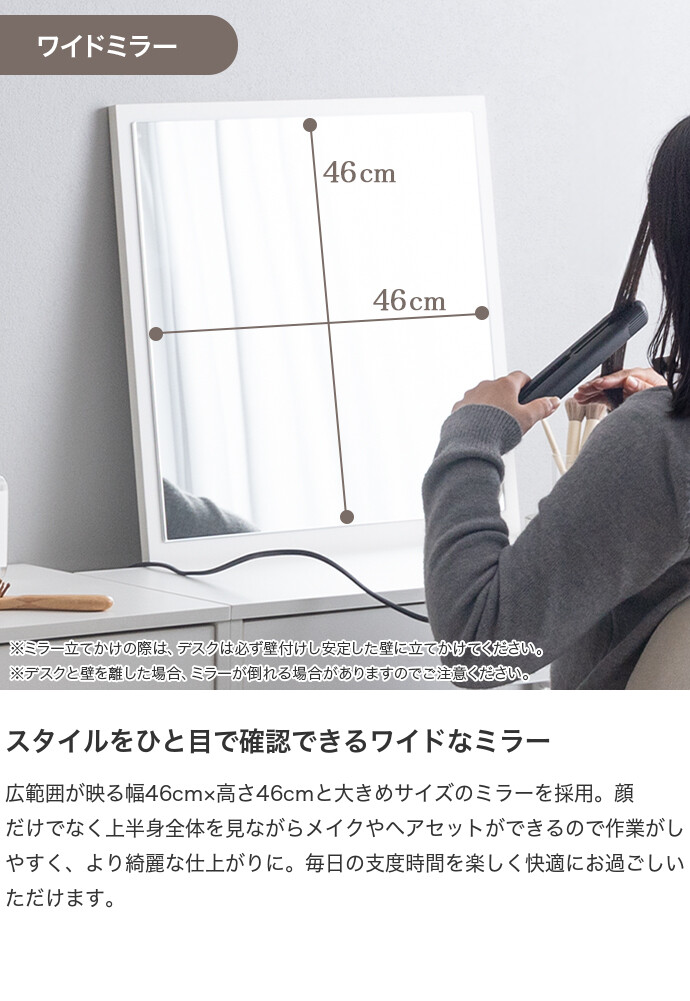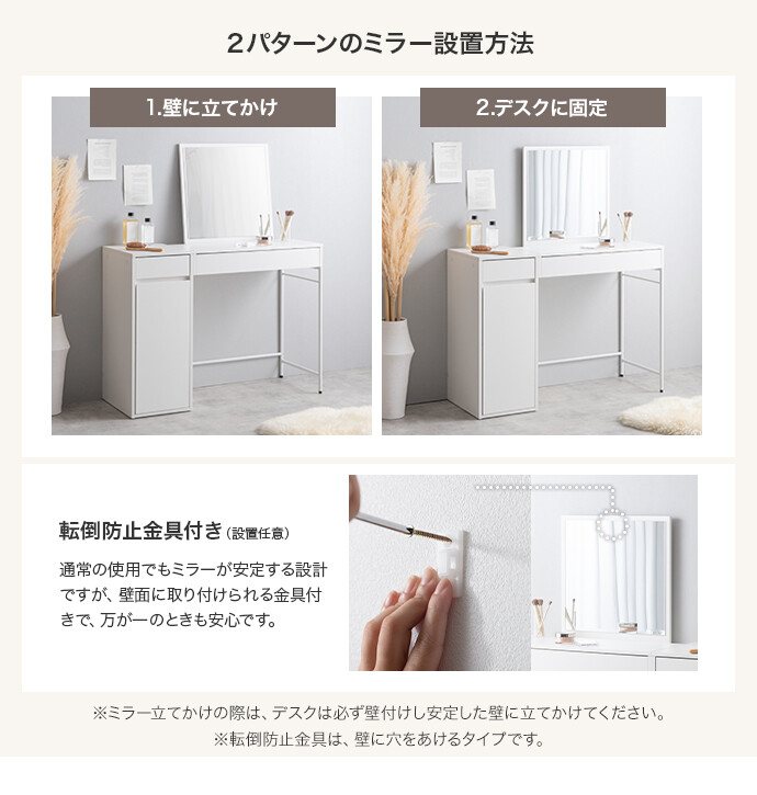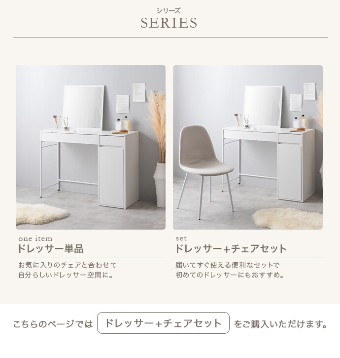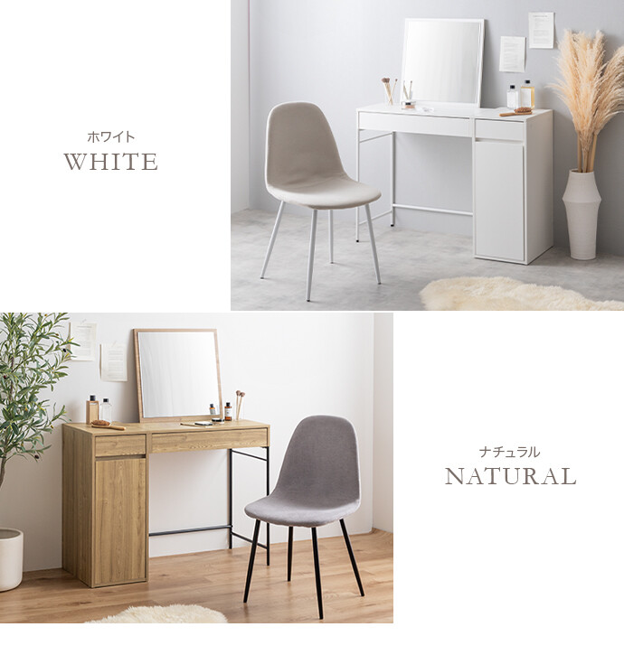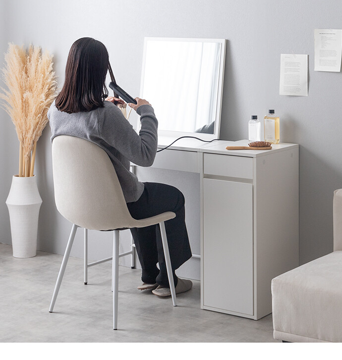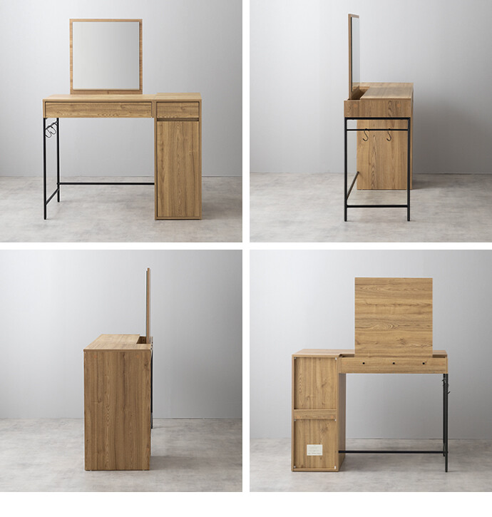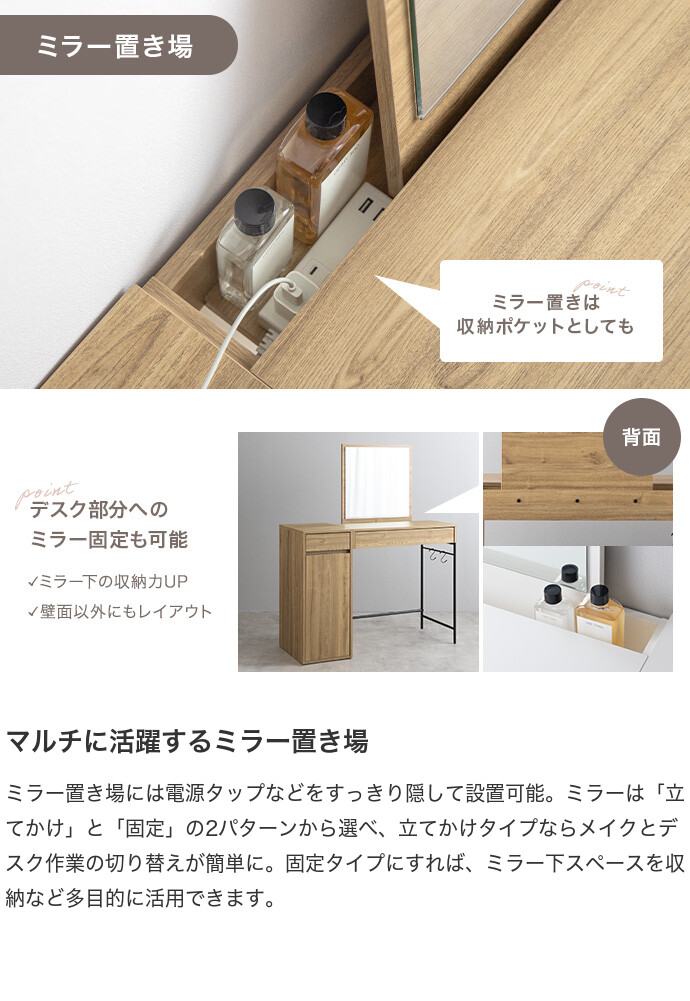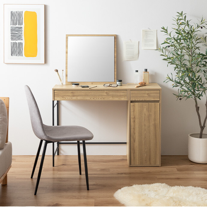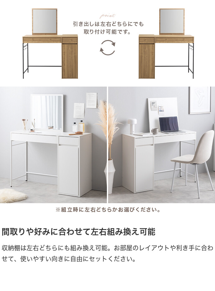 広々と使える天板とワイドミラー、たっぷり収納が魅力のドレッサー+チェアセット。幅100cmの天板とワイドミラーで、毎日のメイク時間を快適に。ミラーは取り外しでき、収納棚は組み立て時に左右の入れ替えも可能。お部屋のレイアウトや利き手に合わせて自由に配置できます。また、ミラー立てかけ利用時にはミラーを裏向けることでデスクとしてお使いいただくことも。