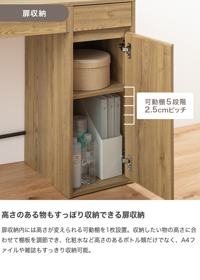 【耐荷重】天板:約40kg 、引き出し:(各)約5kg、可動棚:約10kg、扉収納底板:約15kg、サイドバー:約0.5kg、ミラー置き場:約5kg、チェア:約130kg