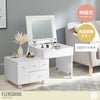 シンプルなデザインながらも機能性抜群なコスメワゴン『Flensburg(フレンスブルク』。天板下収納だけでなく、引き出しがたくさんあるのでかさばりがちなコスメをすっきりと収納できます。また、伸縮タイプなのでコンパクトにしたり、お部屋の広さやインテリアに合わせて横幅をかえることができます。角度が調整できるミラーには3色の切り替えができるLEDライトがついているので自然の明るさに合わせてメイクすることができます。