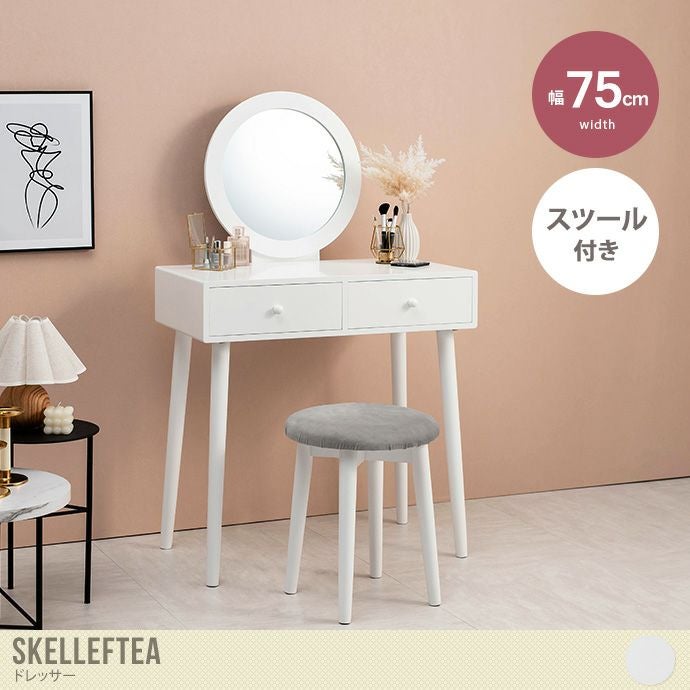 丸型のミラーと韓国風テイストのホワイトが可愛い、スツールがセットになった『Skelleftea(シェレフテオ)』のドレッサー。お部屋に置きやすいコンパクトサイズながら、2杯の引き出し付きでコスメやアクセサリー、ヘアアイロンなどを収納していただけます。また、鏡は取り外しが可能でテレワークなどのデスクとしてもお使いいただけます。