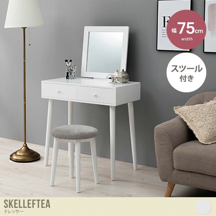 正方形のミラーと韓国風テイストのホワイトが可愛い、スツールがセットになった『Skelleftea(シェレフテオ)』のドレッサー。お部屋に置きやすいコンパクトサイズながら、2杯の引き出し付きでコスメやアクセサリー、ヘアアイロンなどを収納していただけます。また、鏡は取り外しが可能でテレワークなどのデスクとしてもお使いいただけます。