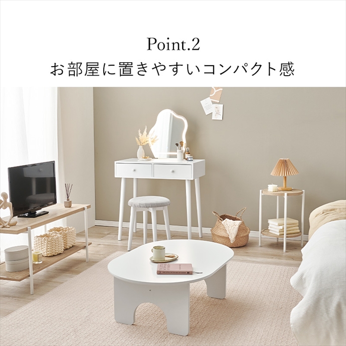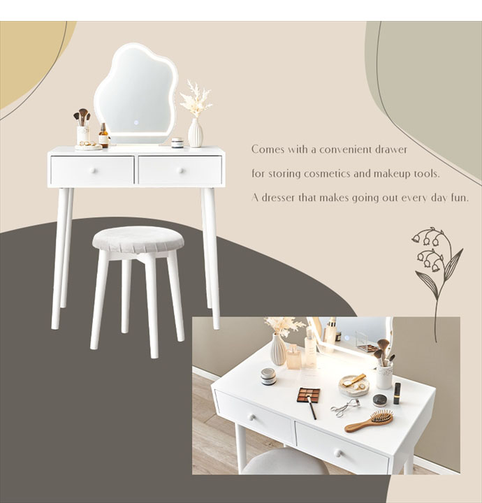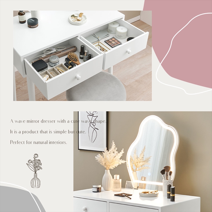 シンプルなデザインとウェーブ形状ミラーが魅力の『Myk(ミーク)』ドレッサー。暖色・自然光・寒色の3色に切り替え可能なLEDライト付きで、明るさも無段階で調節できるため、朝のメイクから夜のケアまでシーンに合わせて快適に使用可能。また毎日使うメイク用品や美容家電は引き出しにすっきり収納でき、天板はいつでも広く使えて整理整頓も簡単です。さらに上質なベロア調生地のスツール付きで、座り心地も快適。ゆったりとメイク時間をお楽しみいただけます。