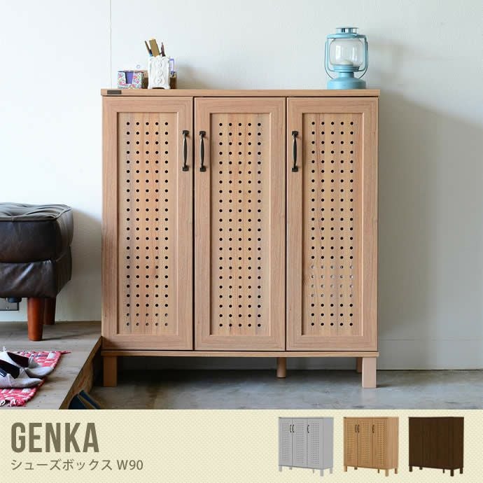 「GENKA -ジェンカ-」シューズボックスは、靴をすっきり収納できる商品となっております。通気性の高いパンチング扉なので、湿気や臭いがこもりにくく靴に優しい構造です。カラーは木目調の温かみある風合いのホワイト・ナチュラル・ブラウンの3色展開となっており、北欧スタイルと相性のいいナチュラルなデザインはお部屋にすっと馴染みます。