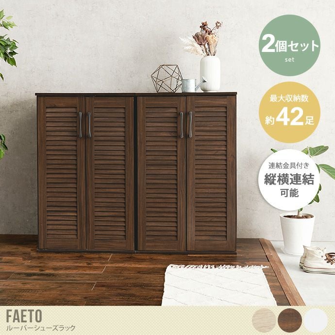 通気性の良いルーバー扉と背面の通気口で湿気や臭いがこもりにくいシューズラック『Faeto(ファエート)』シリーズから2個セットが登場しました。最大約42足も靴を収納可能。縦にも横にも連結可能で固定金具がついているので安心安全。また、棚板から扉まで7cmと幅が開いているので、傘や杖も一緒に収納できます。カラーは3色用意していますので、お部屋のテイストにあったお好きなカラーをお選びください。