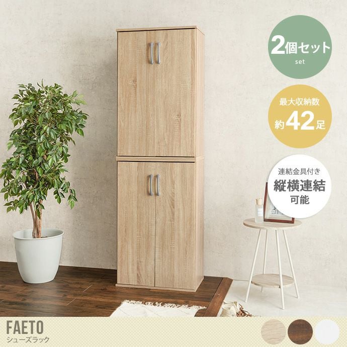 シンプルな見た目で玄関はもちろん室内にもなじみやすいシューズラック『Faeto(ファエート)』シリーズから2個セットが登場しました。最大約42足も靴を収納可能。縦にも横にも連結可能で固定金具がついているので安心安全。また、棚板から扉まで7cmと幅が開いているので、傘や杖も一緒に収納できます。カラーは3色用意していますので、お部屋のテイストにあったお好きなカラーをお選びください。