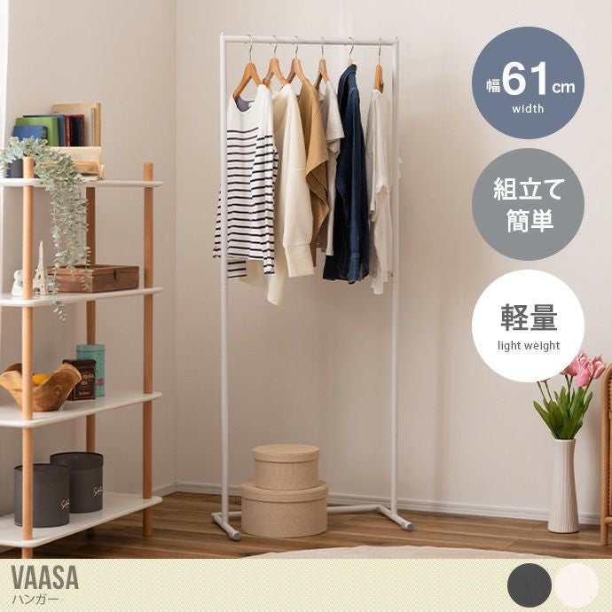 シンプルで無駄のないデザインのハンガーラック『Vaasa(バーサ)』。シャープでスッキリとしたデザインなので、セレクトショップのような雰囲気で魅せる収納ができます。重さ約3kgと軽量設計で1人でも持ち運びが簡単。カラーはダークグレーとホワイトの2色を用意しました。お部屋の雰囲気に合わせてお選びください。