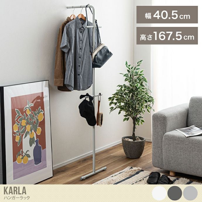 壁に立てかけてお店のようにディスプレイしながら収納できる『Karla(カルラ)』ハンガーラック。支柱一本で支えるハンガーバーは、前から見ても掛けた洋服が美しく見えるよう設計されたデザイン。またスリムなサイズ感でワンルームや限られたスペースにもすっきり設置ができ、シャツやアウターはもちろん、バッグや帽子などの小物類も掛けられる十分な収納力を備えました。毎日使うアイテムをまとめて掛けておけば、朝の支度もスムーズにしていただけます。