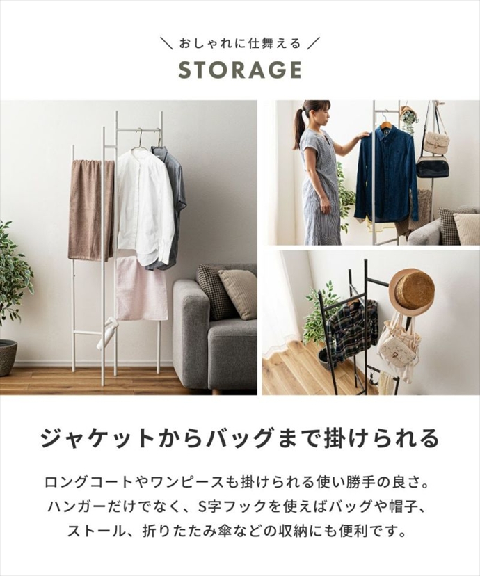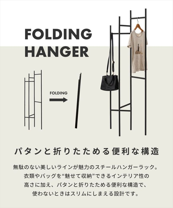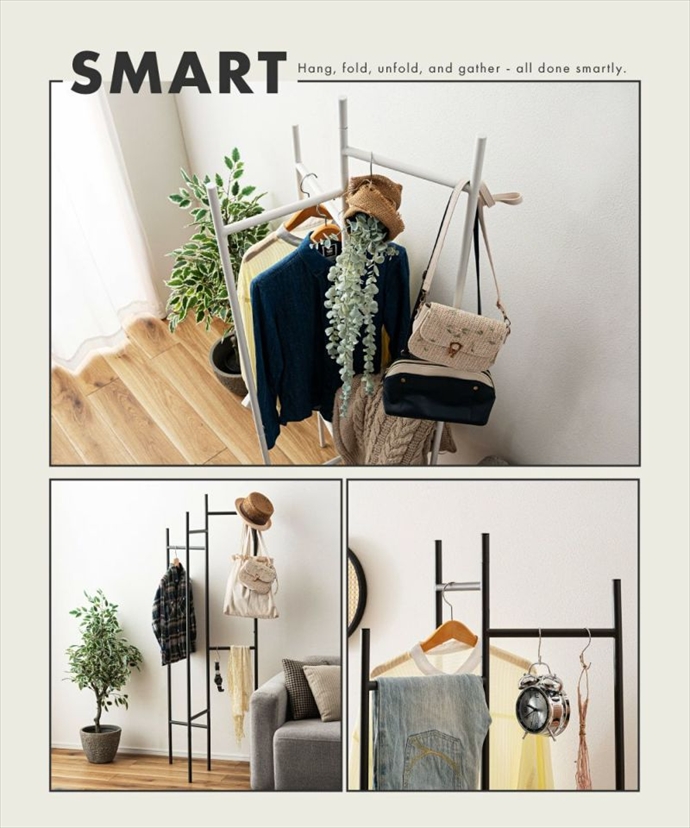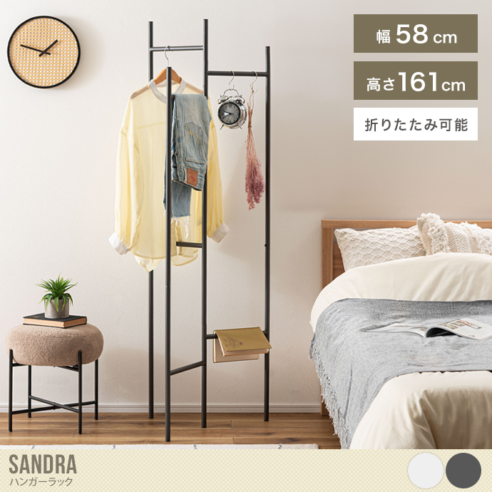 スタイリッシュで無駄のないデザインが魅力の『Sandra(サンドラ)』ハンガーラック。衣類やバッグを見せながら収納できるデザインで、まるでショップのディスプレイのように空間を彩ります。またフレームは可動式のため、お部屋のコーナーにぴったり収めたり、洋服を見せるディスプレイとして使ったりと、レイアウト自由自在。さらに使わない時は折りたためる便利な構造でスリムに収納していただけます。