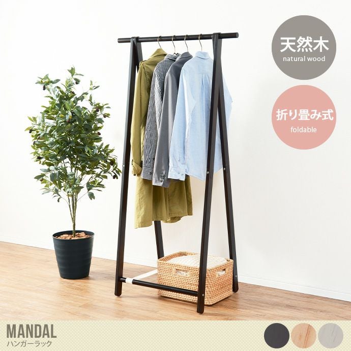 天然木のパイン材を使用した温かみのある『Mandal(マンダール)』シリーズのハンガーラック。洋服や丈の長いコートもすっきり収納できます。折りたためるので、使わないときはコンパクトにでき、移動させるときにも運びやすく便利です。