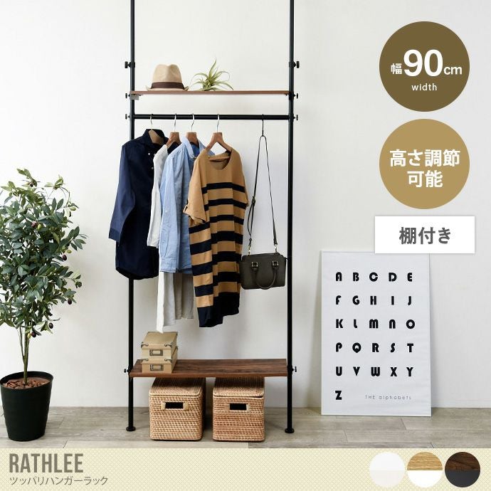 スッキリ収納できる『Rathlee(ラスリー)』のつっぱりハンガーラック。木目調と無地の棚板を展開しており、どんなテイストのお部屋にも馴染むシンプルなデザインになっております。棚板とハンガーバーは無段階に高さ調節が可能なので、コートなどの丈長衣類も掛けられて便利です。