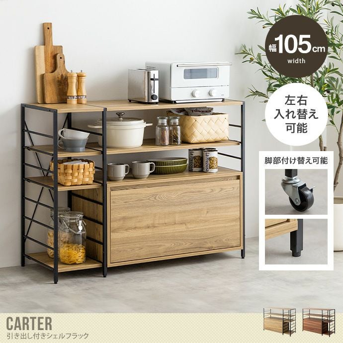 【送料無料】Carter カーター 幅105 ラック オープン シェルフ キッチン サイド 収納 本棚 可動棚 スリム 薄型 引き出し 左右入れ替え可能 2way 家電 食器 リビング デスク キャスター アジャスター 一人暮らし ワンルーム S字フック 仕切り オーク