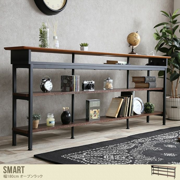 深みのある木目色×ブラックスチールのフレームで、シックで落ち着きある風合いのオープンラック『Smart』。幅180cmのワイドサイズでありながら、奥行き28cmでとってもスリム。スッキリしたデザインで置く場所を選びません。リビングだけでなくプライベートルームに置いても圧迫感がなく、ワンルームマンションでもお使いいただけるサイズ感です。とにかく収納力バツグンで、本や雑誌、小物類などをこれ1台でオシャレに片付けられます。