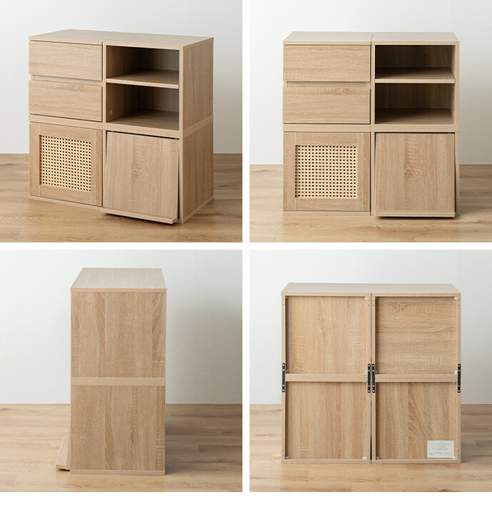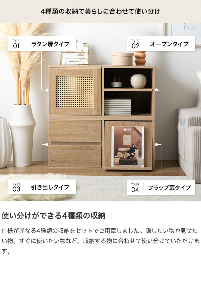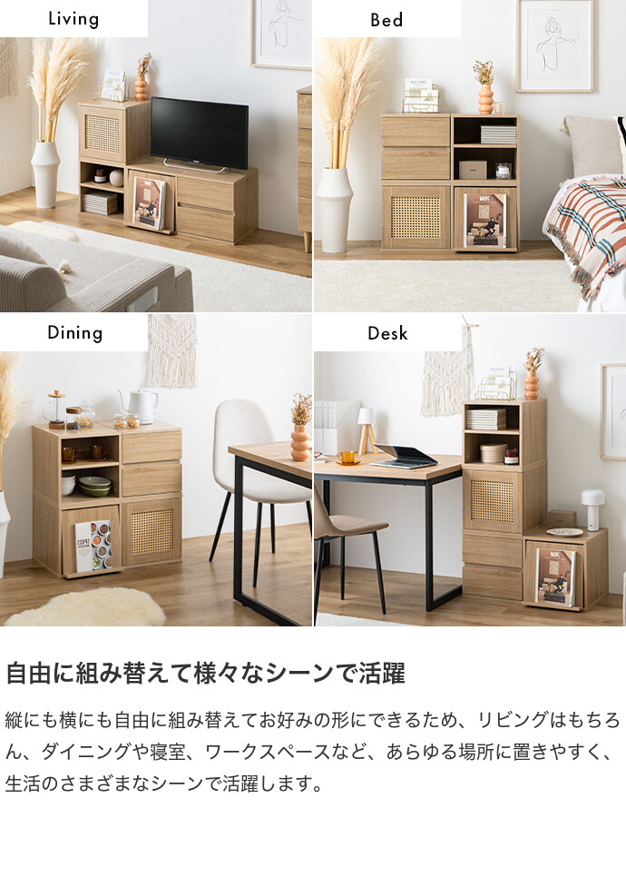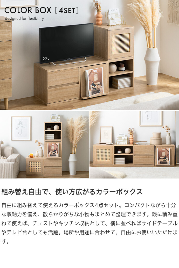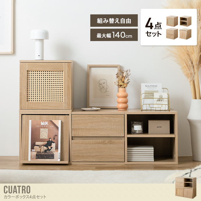 【送料無料】Cuatro クアトロ 幅35 幅140 カラーボックス キューブボックス 本棚 棚 収納ボックス 収納 ラック シェルフ チェスト テレビ台 おしゃれ おすすめ 安い 4点セット 扉付き 木製 引き出し 組み換え 自由 積み重ね フラップ ラタン ナチュラル
