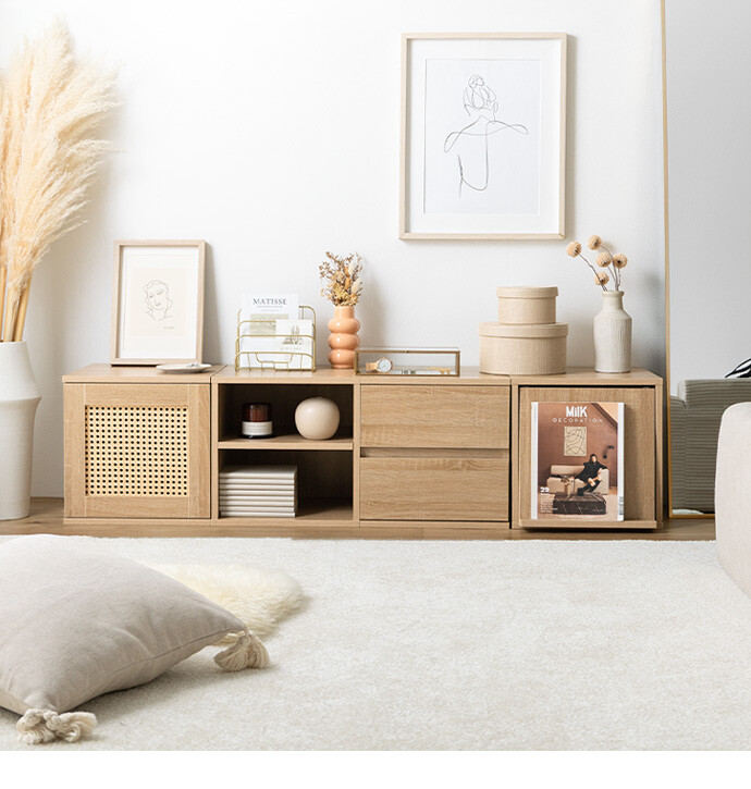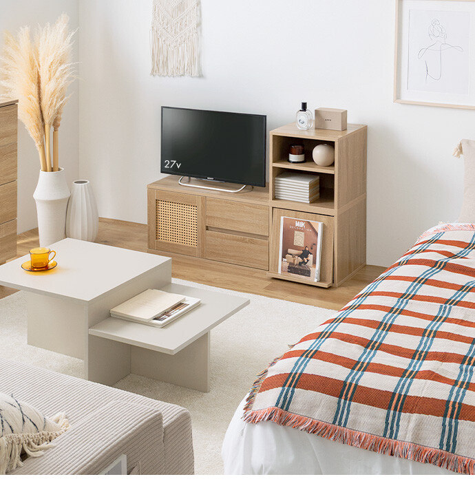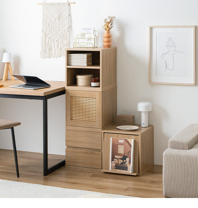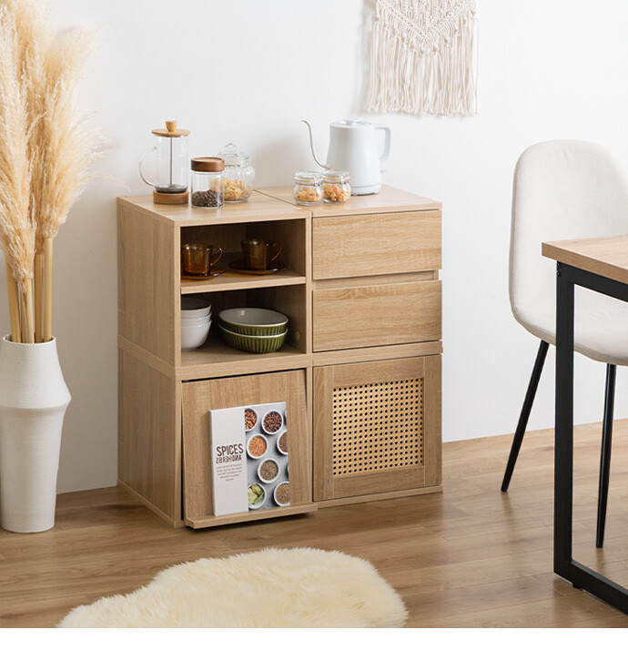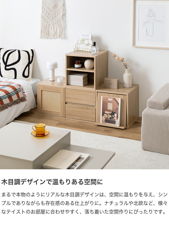 自由に組み替えて使えるカラーボックス4点セット。コンパクトながら十分な収納力を備え、散らかりがちな小物もまとめて整理できます。縦に積み重ねて使えば、チェストやキッチン収納として、横に並べればサイドテーブルやテレビ台としても活躍。場所や用途に合わせて、自由にお使いいただけます。また、まるで本物のようにリアルな木目調デザインは、空間に温もりを与え、シンプルでありながらも存在感のある仕上がりに。ナチュラルや北欧など、様々なテイストのお部屋と相性抜群です。