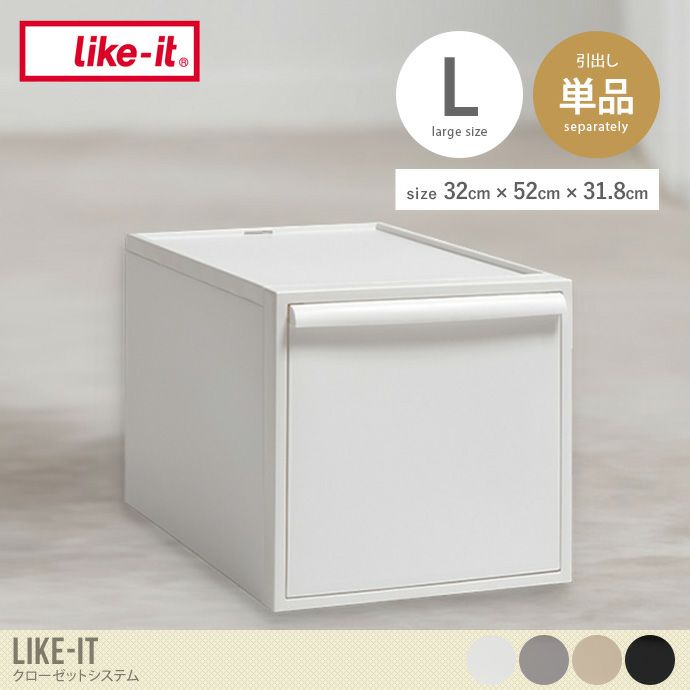 使いやすい引き出しタイプの『Like-it(ライクイット)』クローゼットシステム。内部には抜け落ちを防止するストッパー付きで、目一杯引っ張りだしても抜け落ちない構造に。奥にしまったものも、スムーズに出し入れしていただけます。また強度に優れたたわみにくい素材を使用しているため、スタッキングも可能です。背面には転倒を防止するロック付きで、ぐらつきなくお使いいただけます。
