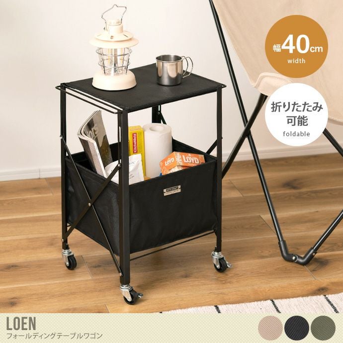 ミリタリーカラーにおしゃれなメタルプレートが特徴の『Loen(ローエン)』シリーズからフォールディングテーブルワゴンが登場。MDF板を使用した天板とバスケットは安定感抜群でたわむことがないので、安心してお使いいただけます。コンパクトに折りたたむことができ、軽量なので外への持ち運びもラクに。使わないときはクローゼットの隙間などに収納が可能です。おうちの中ではもちろんアウトドアでも大活躍。様々なシーンで便利にお使いいただけます。