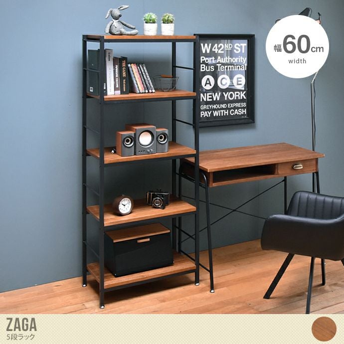 【送料無料】幅60 収納 ラック オープンラック スチールラック リビングラック キッチンラック 飾り棚 本棚 棚 シェルフ ウッドシェルフ おしゃれ おすすめ ZAGA ザガ 5段 木目調 木製 天然木 アイアン コンパクト ワンルーム 一人暮らし 省スペース アジャスター付き ブラウン